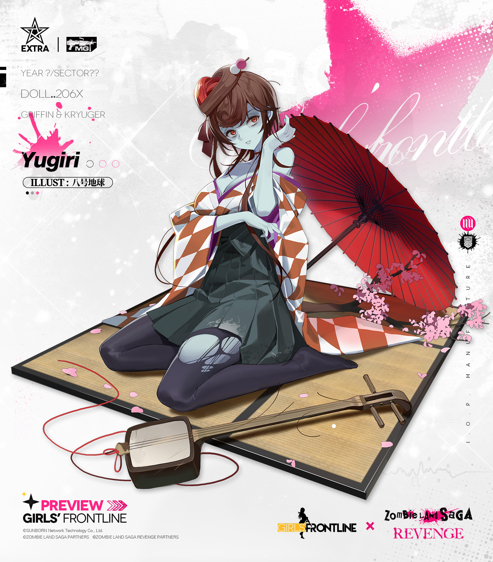 1girl argyle_clothes argyle_kimono bahao_diqiu black_pantyhose blue_skin breasts brown_hair character_name checkered_clothes checkered_kimono cherry_blossoms colored_skin commentary copyright_name crossover dango_hair_ornament english_commentary food-themed_hair_ornament full_body girls'_frontline green_skirt hair_ornament heart heart-shaped_hair highres japanese_clothes kimono large_breasts long_hair long_sleeves looking_at_viewer official_art oil-paper_umbrella oiran pantyhose promotional_art red_eyes red_umbrella sitting skirt solo torn_clothes torn_pantyhose umbrella yuugiri_(zombie_land_saga) zombie zombie_land_saga