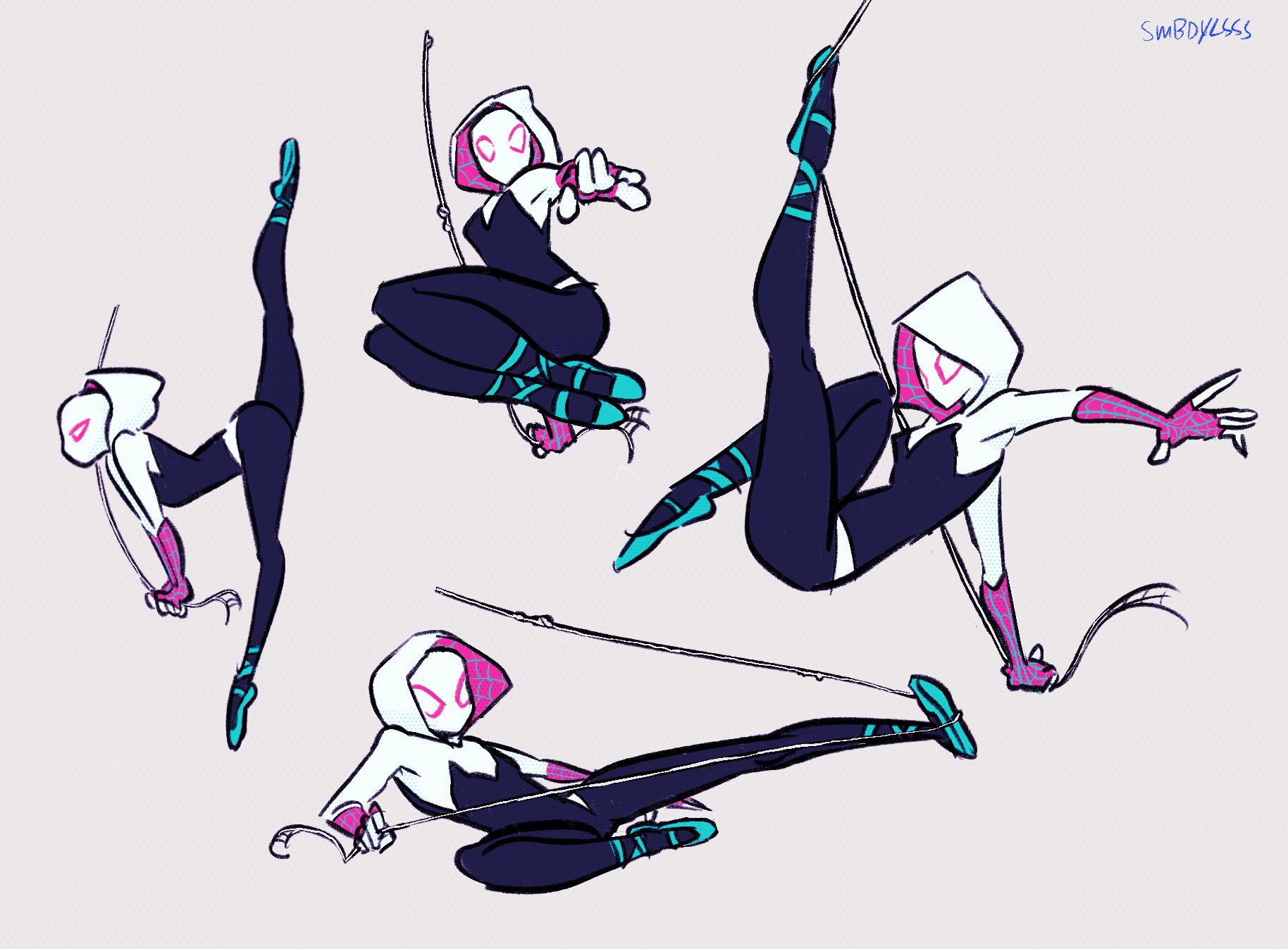 1girl aqua_shoes ass ballet ballet_slippers bodysuit breasts gwen_stacy highres hood hooded_bodysuit looking_at_viewer marvel medium_breasts multiple_views shoes silk skin_tight smbdylsss spider-gwen spider-man:_across_the_spider-verse spider-man:_into_the_spider-verse spider-man_(series) spider-verse spider_web spider_web_print split superhero_costume