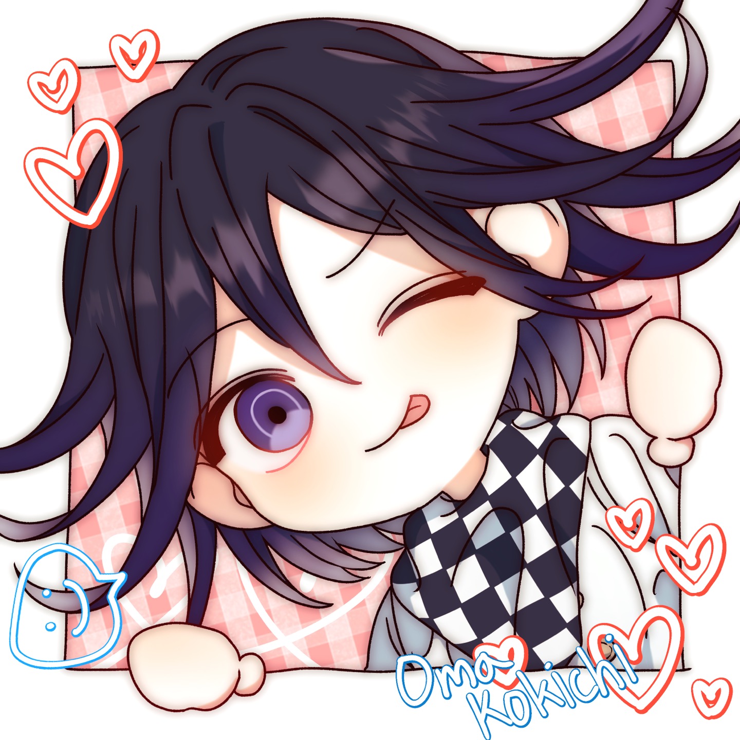 1boy ;p black_hair blush border character_name checkered_clothes checkered_scarf danganronpa_(series) danganronpa_v3:_killing_harmony flipped_hair han_(hd_d26) hands_up heart highres jacket looking_at_viewer male_focus oma_kokichi one_eye_closed purple_eyes purple_hair scarf short_hair smile tongue tongue_out unmoving_pattern white_border white_jacket