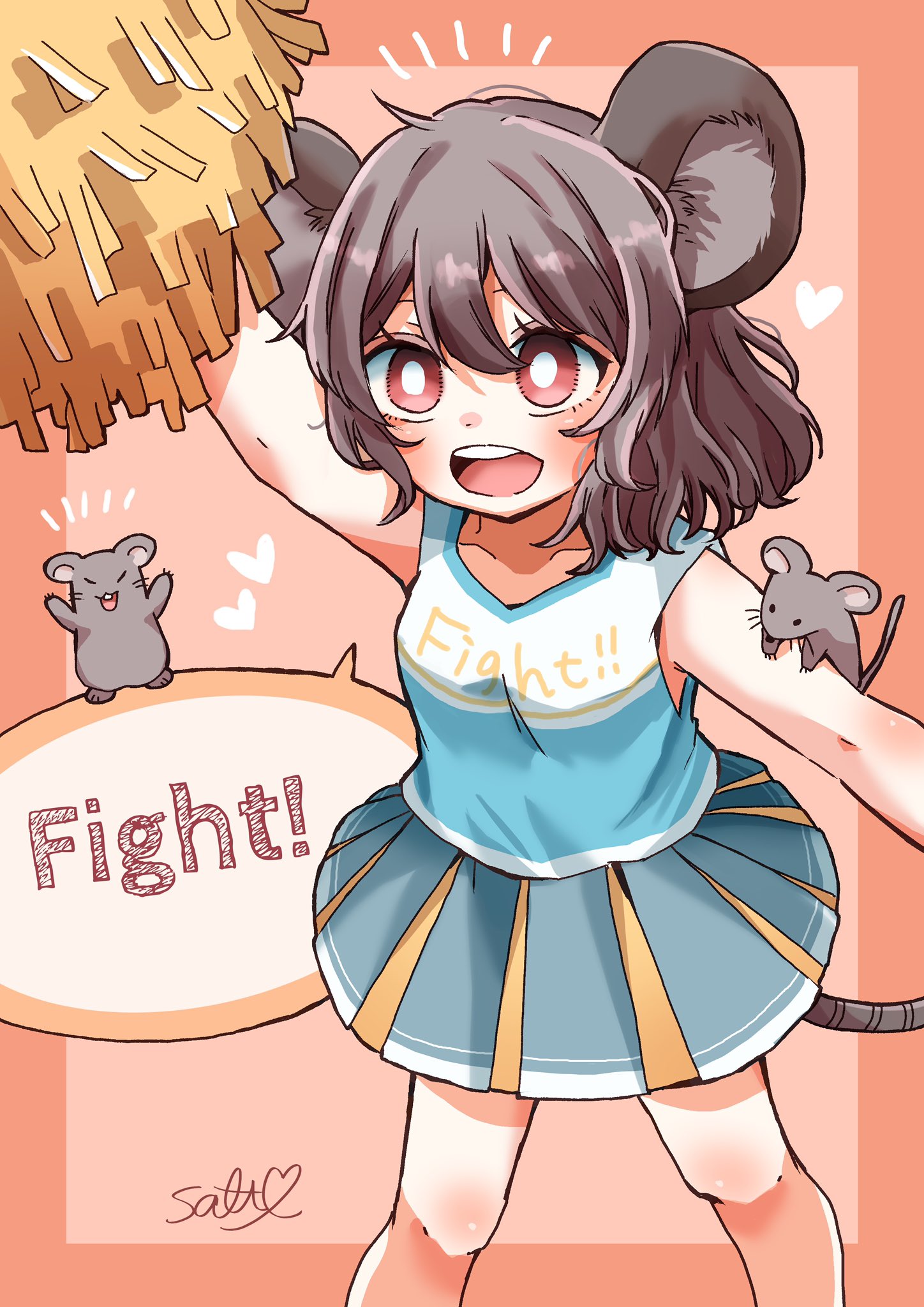 1girl animal_ears blue_shirt bright_pupils cheerleader clothes_writing commentary_request commission english_text feet_out_of_frame grey_hair grey_skirt highres holding holding_pom_poms looking_at_viewer mouse_(animal) mouse_ears mouse_girl mouse_tail nazrin open_mouth partial_commentary pom_pom_(cheerleading) pom_poms red_eyes salt_(saltty) shirt short_hair signature skeb_commission skirt sleeveless sleeveless_shirt speech_bubble tail teeth touhou upper_teeth_only white_pupils