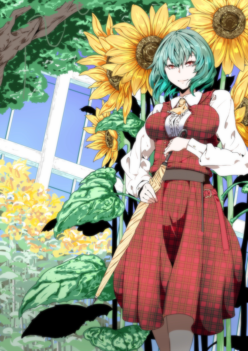 1girl ascot belt blush branch breasts brown_belt buttons center_frills collared_shirt commentary_request flower frills garden_of_the_sun green_hair highres holding holding_umbrella kazami_yuuka large_breasts long_sleeves looking_at_viewer parasol plaid_clothes plaid_skirt plaid_vest potato_pot red_eyes red_skirt red_vest shirt short_hair skirt smile solo standing sunflower touhou tree umbrella upper_body vest white_shirt wing_collar wrist_cuffs yellow_ascot