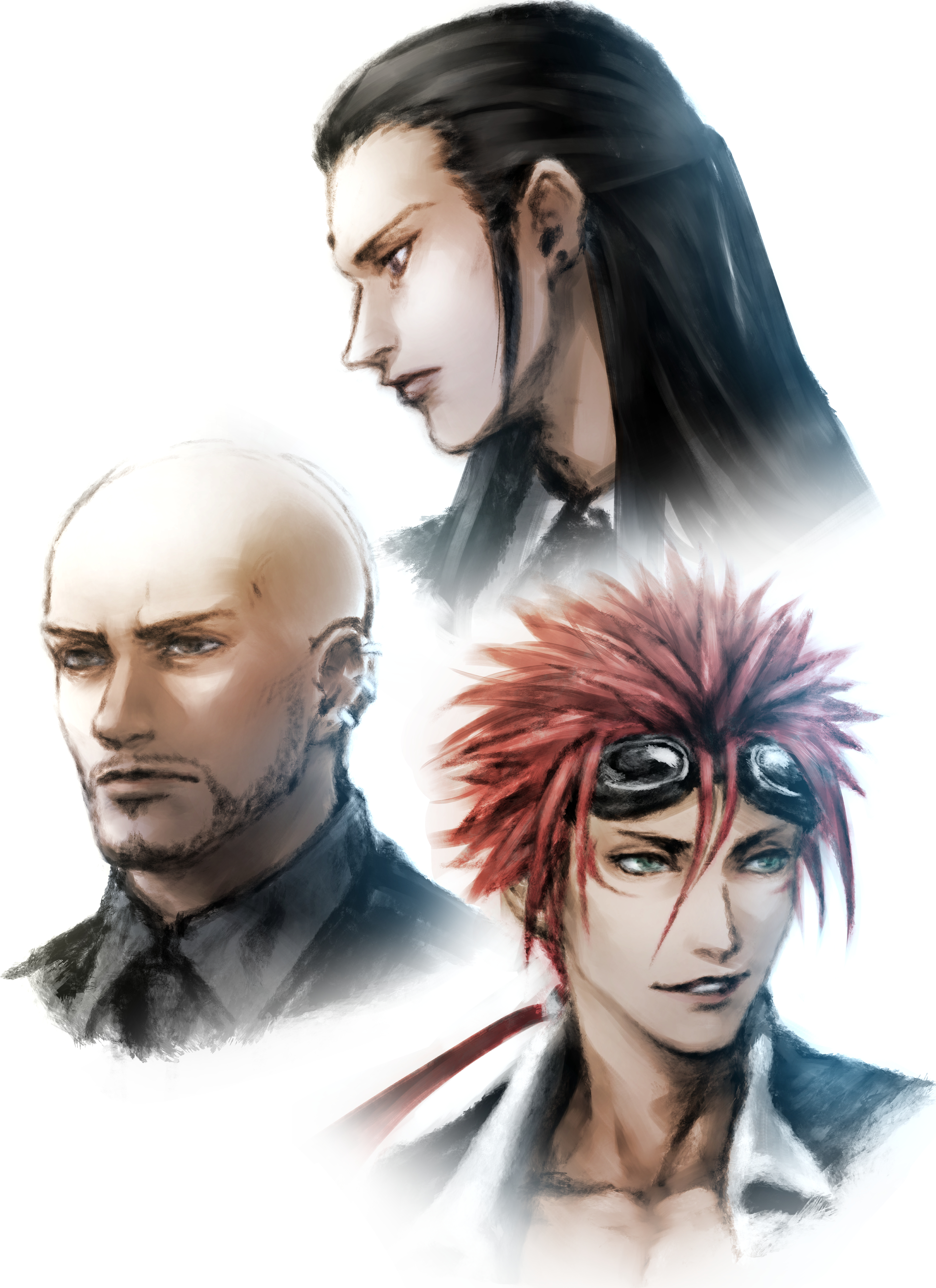 3boys absurdres bald bindi black_hair black_jacket black_shirt brown_eyes collared_shirt earrings facial_hair facial_mark final_fantasy final_fantasy_vii final_fantasy_vii_remake goatee goggles goggles_on_head grey_eyes hair_between_eyes hair_pulled_back hair_tie hasekou_g highres jacket jewelry long_hair low_ponytail male_focus multiple_boys multiple_earrings parted_lips ponytail portrait profile reno_(ff7) rude_(ff7) shirt short_hair_with_long_locks sidelocks smirk spiked_hair suit_jacket tseng unworn_eyewear white_background white_shirt