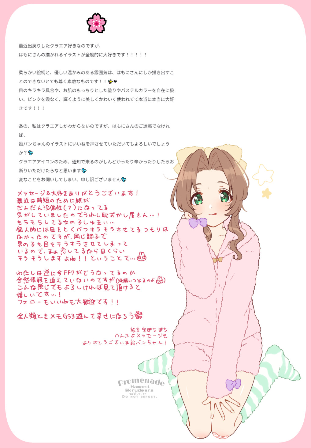 1girl aerith_gainsborough alternate_costume artist_name bow brown_hair dated final_fantasy final_fantasy_vii final_fantasy_vii_remake full_body green_eyes hair_bow hand_on_own_face hand_on_own_knee highres kneeling krudears light_blush long_hair long_sleeves looking_at_viewer no_shoes pajamas parted_bangs pink_pajamas pink_shirt pink_shorts purple_bow shirt short_shorts shorts sidelocks socks solo star_(symbol) striped_clothes striped_socks tongue tongue_out twitter_username wavy_hair white_background yellow_bow