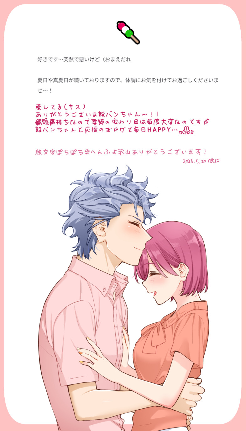1boy 1girl bob_cut breasts closed_eyes collared_shirt couple facing_another grey_hair hair_between_eyes hand_on_another's_chest hetero highres krudears medium_breasts multicolored_nails nail_polish open_mouth orange_shirt pink_hair pink_shirt profile protagonist_(tokimemo_gs3) shirt shitara_seiji short_hair short_sleeves smile tokimeki_memorial tokimeki_memorial_girl's_side tokimeki_memorial_girl's_side_3rd_story white_background