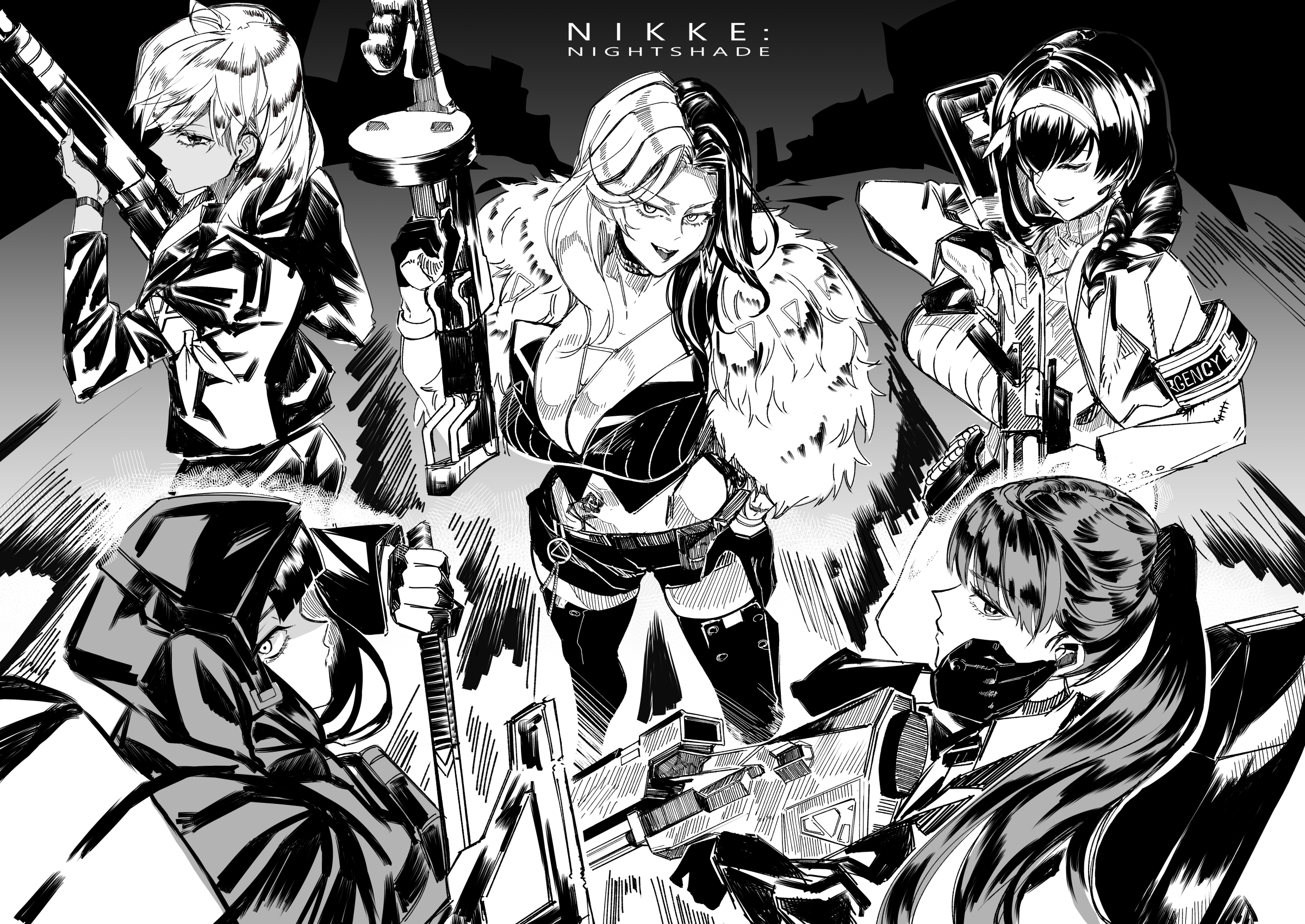 5girls axe belt_pouch black_gloves boots bracelet breasts choker cleavage coat collarbone crop_top d_(nikke) dolla_(nikke) fur_coat gloves goddess_of_victory:_nikke gun half_gloves hand_on_own_hip highres holding holding_axe holding_weapon jacket jewelry large_breasts looking_at_viewer mary_(nikke) medium_breasts midriff multicolored_hair multiple_girls nagasaki_ken_(stellar_wind) necklace parted_hair parted_lips pouch rifle rosanna_(nikke) shirt short_shorts shorts shotgun smile sniper_rifle split-color_hair standing stomach_tattoo striped_clothes striped_shirt sugar_(nikke) sweater tattoo thigh_boots vertical-striped_clothes vertical-striped_shirt weapon