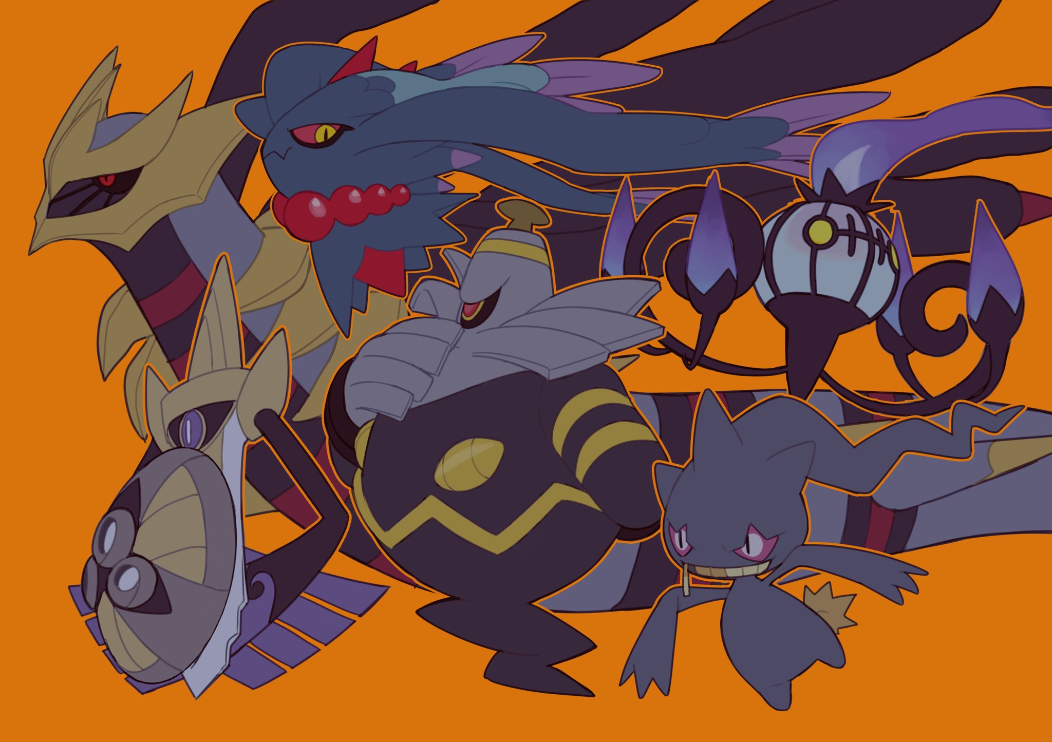 aegislash banette bead_necklace beads black_eyes chandelure colored_sclera dusknoir fire flutter_mane gen_3_pokemon gen_4_pokemon gen_5_pokemon gen_6_pokemon ghost giratina giratina_(origin) highres jewelry legendary_pokemon necklace nintendo no_humans orange_background pokemon pokemon_(creature) red_sclera shield simple_background sword v_(govvvvw) weapon wings yellow_eyes
