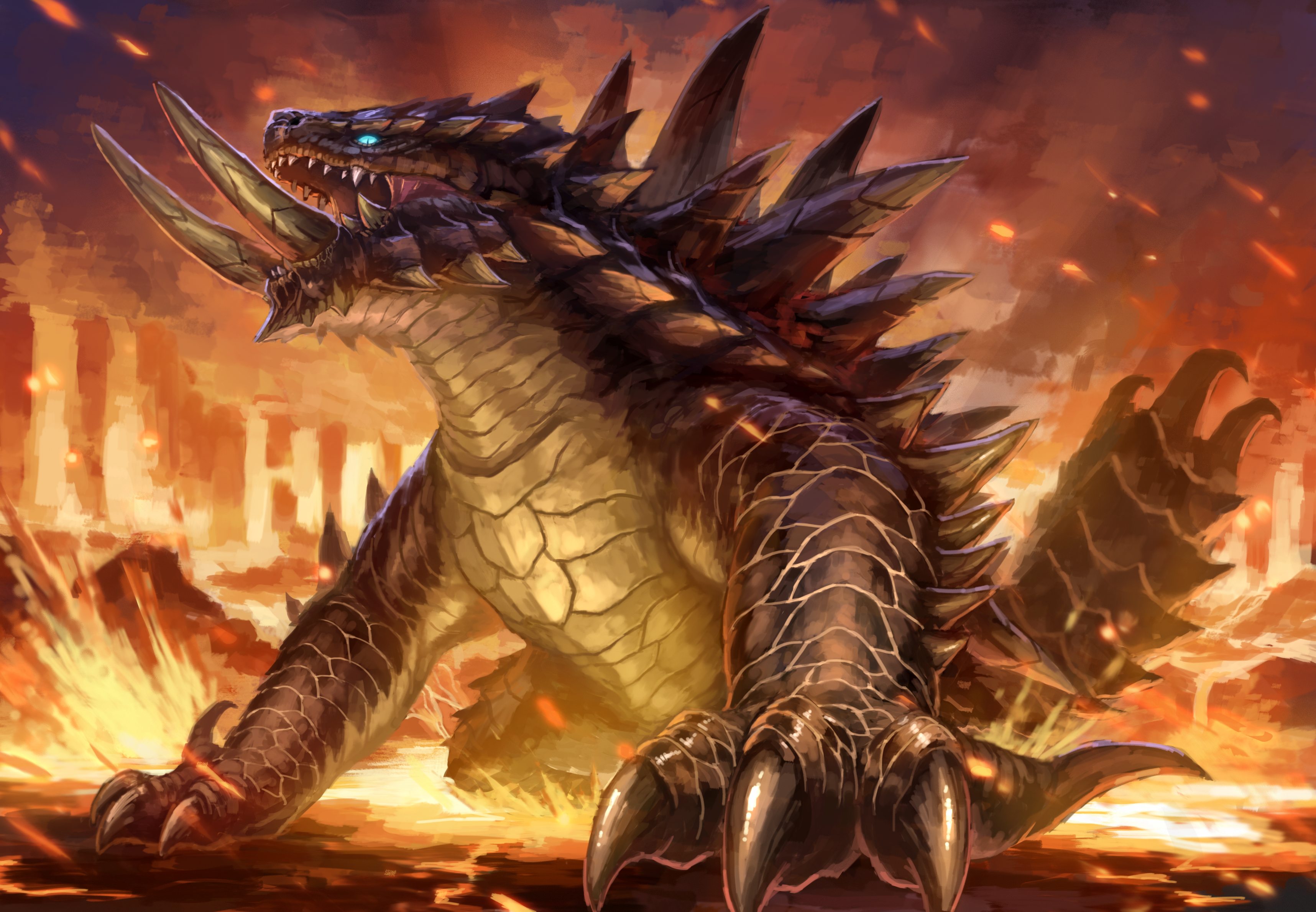 absurdres akantor blue_eyes claws giant giant_monster glowing glowing_eyes highres horns lava monster monster_hunter_(series) nasuno_posi no_humans sharp_tail spiked_tail tail