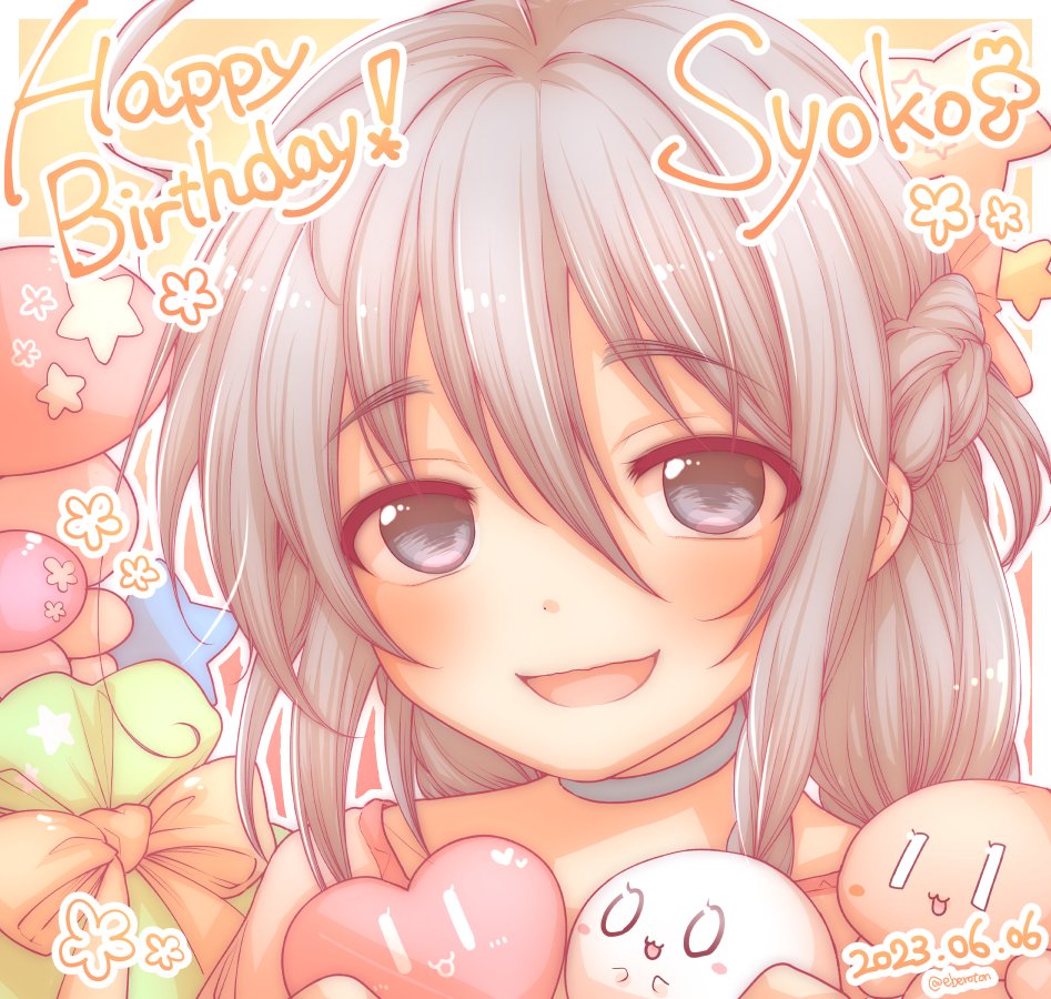 1girl ahoge blush braid choker close-up dated eberoton french_braid grey_eyes grey_hair hair_between_eyes happy_birthday heart hoshi_syoko idolmaster idolmaster_cinderella_girls long_hair looking_at_viewer mushroom open_mouth smile solo star_(symbol) stuffed_toy