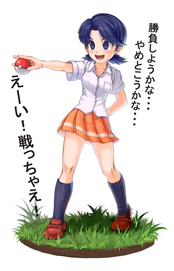 1girl :d black_hair black_socks blue_eyes breast_pocket bright_pupils brown_shoes collared_shirt commentary_request full_body grass hapchi holding holding_poke_ball lass_(pokemon) lass_(pokemon_rse) medium_hair nintendo open_mouth orange_skirt outstretched_arm pleated_skirt pocket poke_ball poke_ball_(basic) pokemon pokemon_ruby/sapphire/emerald ribbed_socks shirt shoes short_sleeves simple_background skirt smile socks solo standing teeth tongue translation_request upper_teeth_only white_background white_shirt