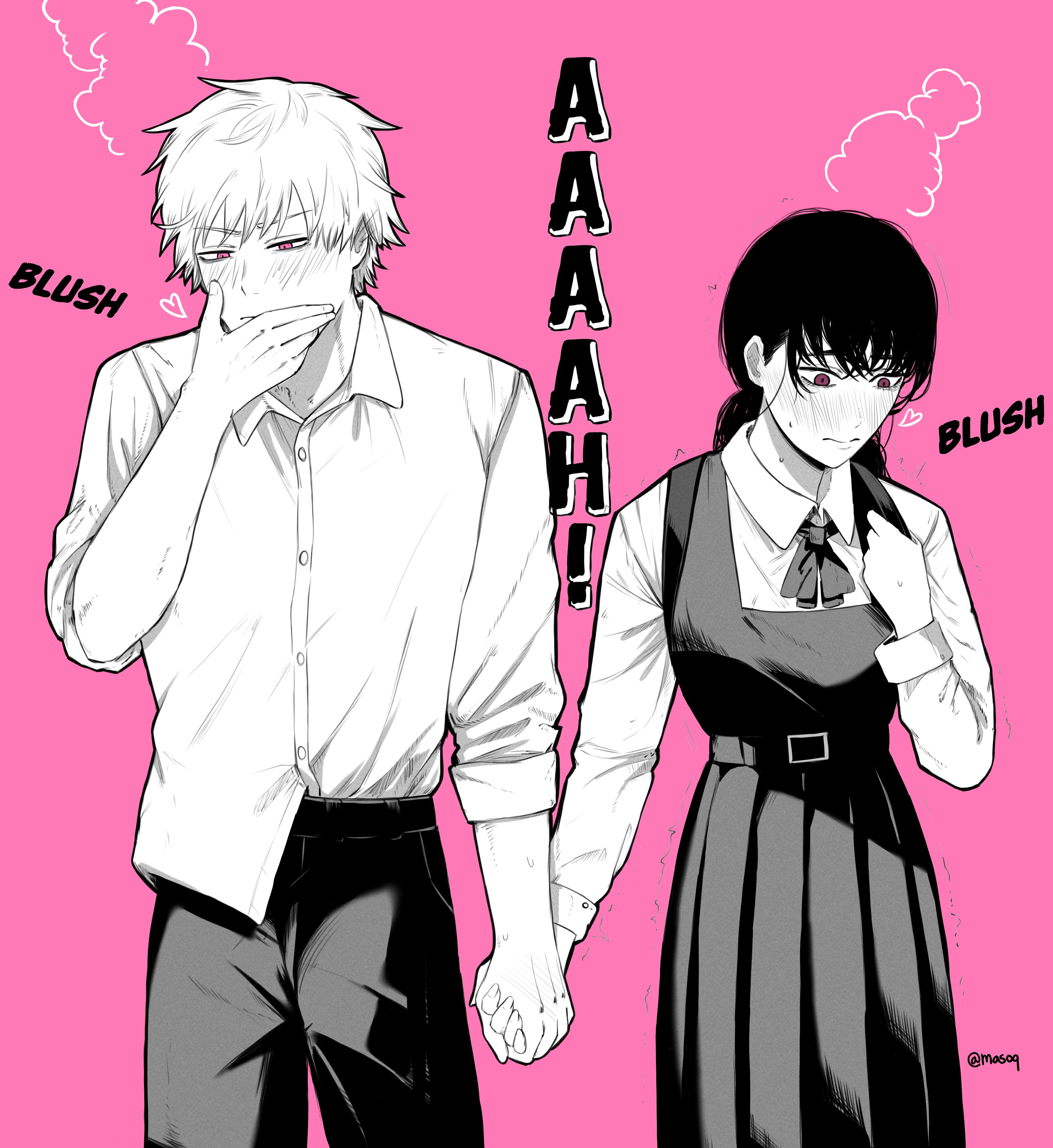 1boy 1girl absurdres blush buttons chainsaw_man commentary denji_(chainsaw_man) dress english_commentary english_text fourth_east_high_school_uniform heart highres holding_hands long_hair long_sleeves low_twintails masoq mitaka_asa neck_ribbon pants partially_colored pinafore_dress pink_background pink_eyes purple_eyes ribbon school_uniform shirt short_hair simple_background sleeveless sleeveless_dress twintails twitter_username