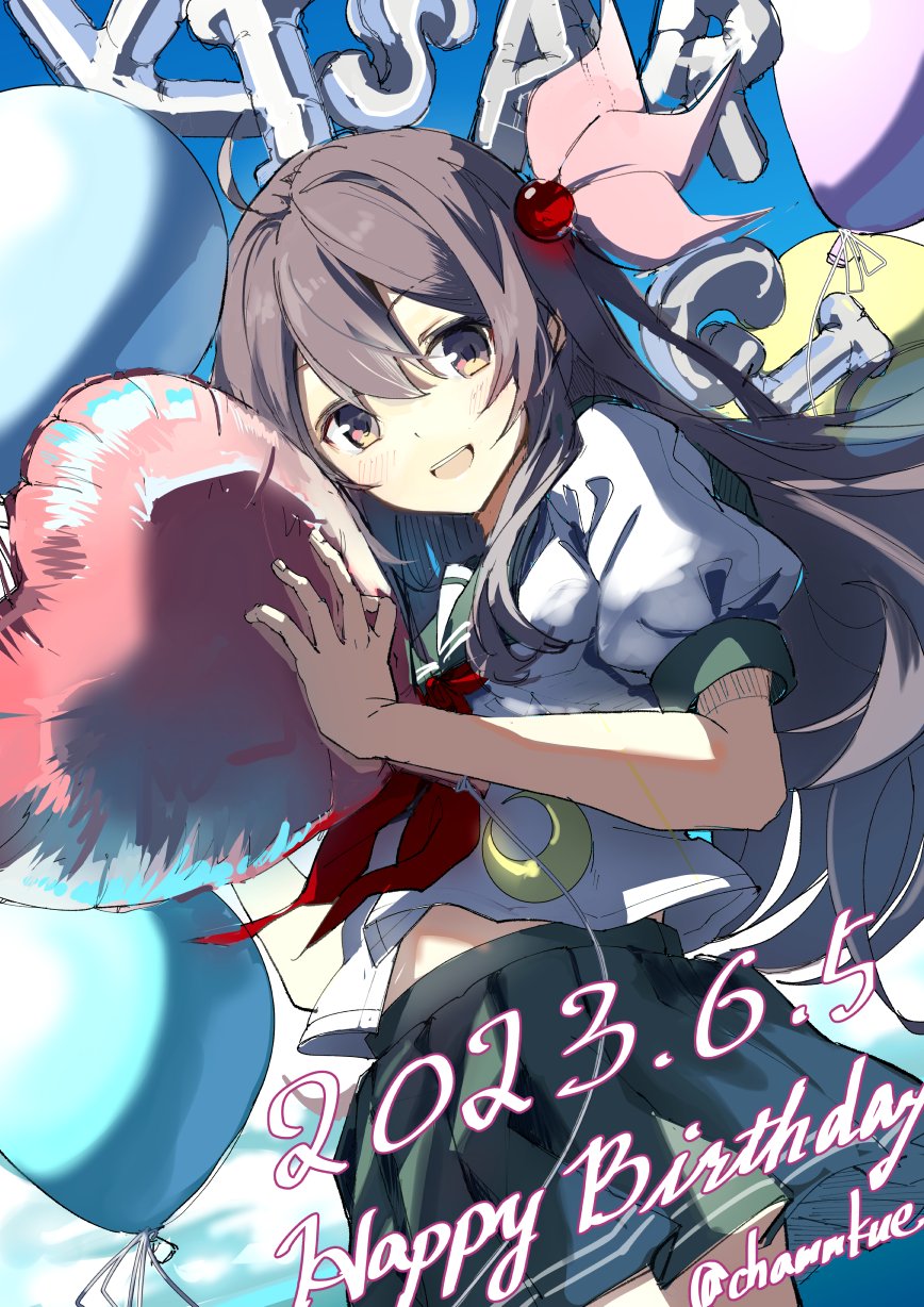 1girl balloon brown_hair chamu_(chammkue) cowboy_shot crescent crescent_pin green_sailor_collar green_skirt happy_birthday heart_balloon highres kantai_collection kisaragi_(kancolle) kisaragi_kai_ni_(kancolle) long_hair neckerchief pleated_skirt purple_eyes red_neckerchief sailor_collar skirt smile solo