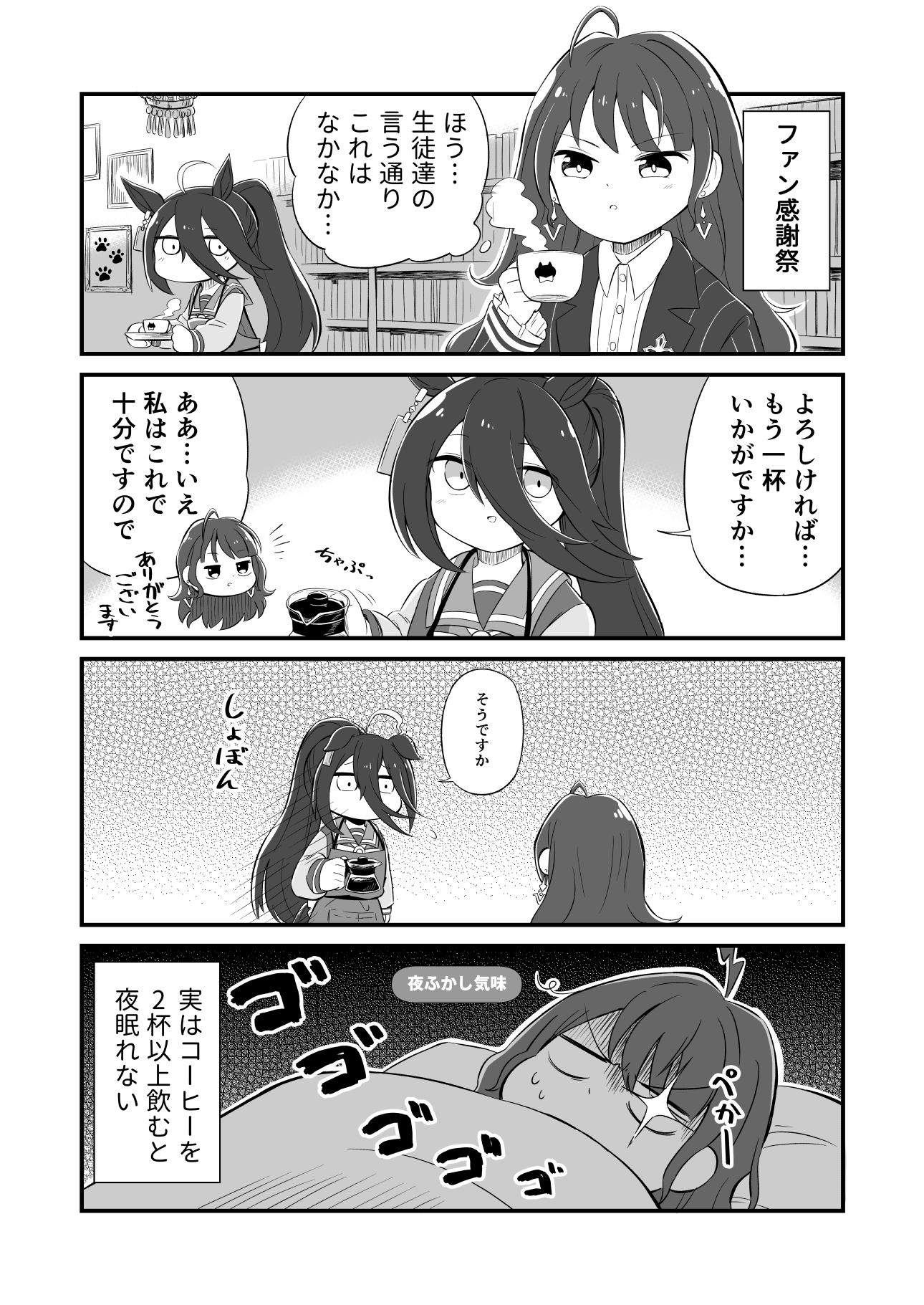 2girls 4koma ahoge animal_ears animal_print apron bookshelf cat_print coffee coffee_pot comic commentary_request cup earrings ears_down formal_clothes futon fuyake_taiyaki glint greyscale hair_between_eyes highres holding horse_ears horse_girl jewelry jitome kashimoto_riko long_bangs long_hair long_sleeves manhattan_cafe_(umamusume) menacing_(jojo) monochrome multicolored_hair multiple_girls narration notice_lines official_alternate_hairstyle outline outside_border pinstripe_pattern pinstripe_suit ponytail sailor_collar sailor_shirt school_uniform shirt single_earring speech_bubble steam striped suit sweatdrop tracen_school_uniform translated umamusume winter_uniform
