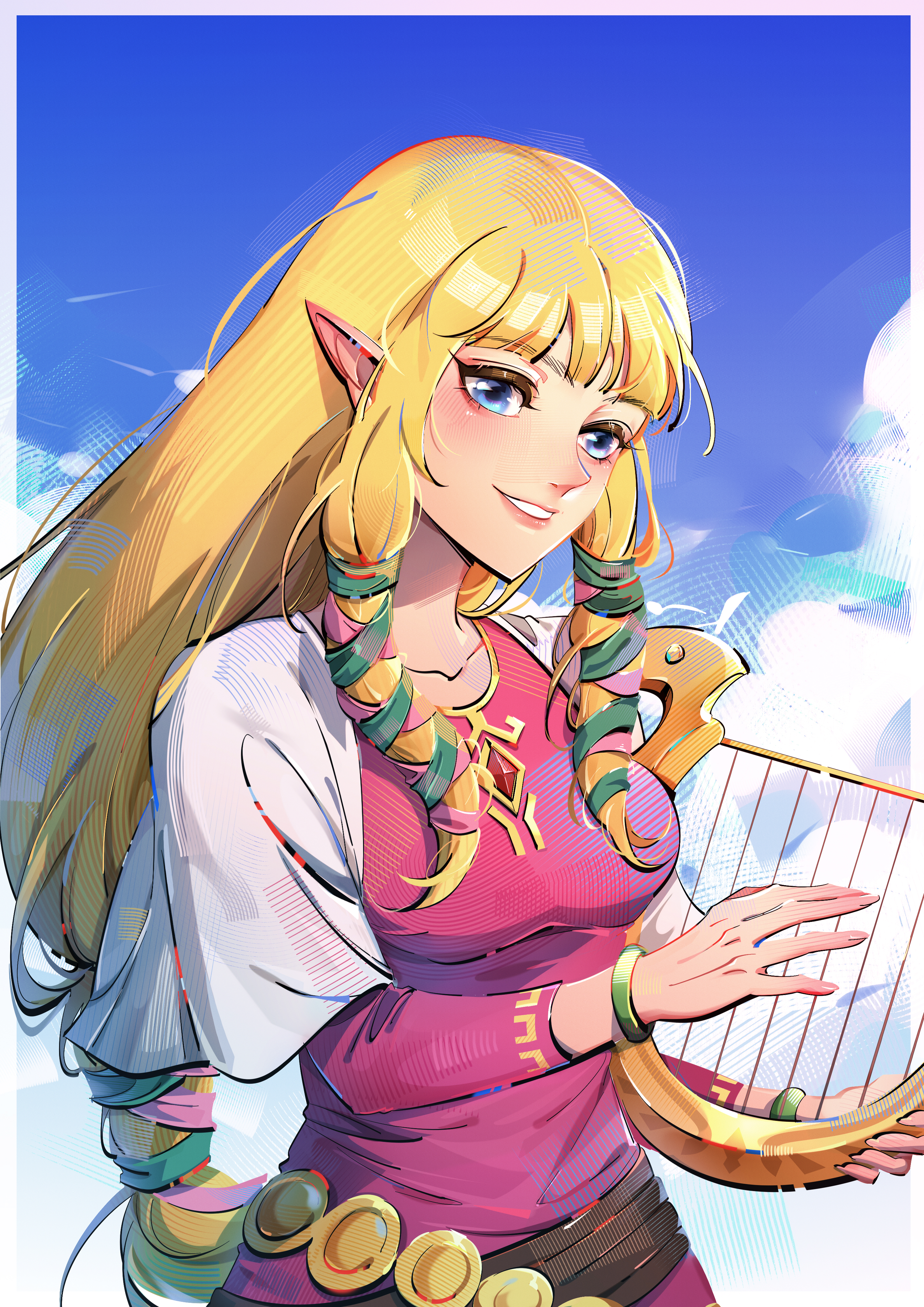 1girl absurdres blonde_hair blue_eyes blue_sky blunt_bangs braid braided_ponytail breasts cloud collarbone commentary_request dress green_eyes hair_ribbon harp highres holding holding_instrument instrument long_hair low_ponytail lyre medium_breasts momoju163 music nintendo parted_lips pink_dress playing_instrument pointy_ears ponytail princess_zelda ribbon sky smile solo the_legend_of_zelda the_legend_of_zelda:_skyward_sword tress_ribbon upper_body