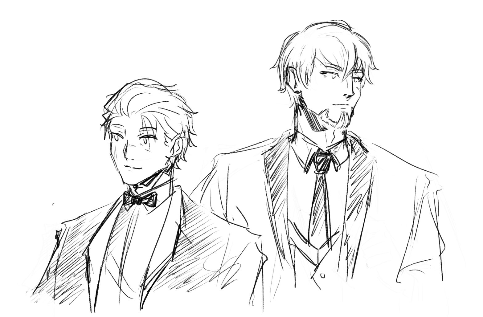 2boys alternate_costume beard bow bowtie canute closed_mouth facial_hair facial_scar formal_clothes hair_between_eyes height_difference light_smile looking_to_the_side male_focus monochrome multiple_boys multiple_scars necktie scar scar_on_cheek scar_on_face scar_on_nose short_hair simple_background sketch sopa_gamja suit thorfinn tuxedo vest vinland_saga white_background wing_collar