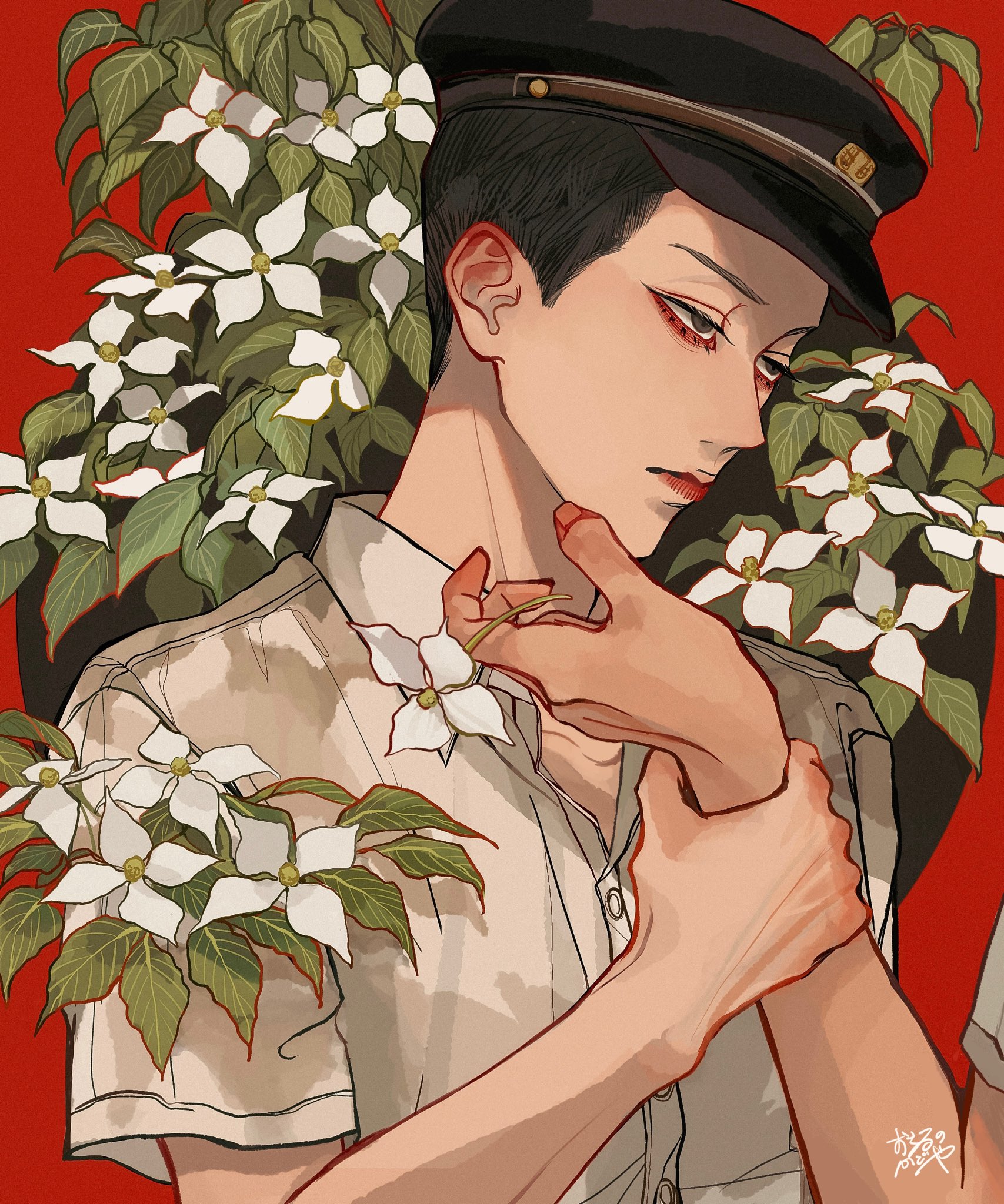 2boys black_hair black_headwear brown_eyes closed_mouth collared_shirt commentary_request dogwood_(flower) flower half-closed_eyes hat highres holding_another's_wrist kagoya1219 leaf looking_at_another male_focus multiple_boys original out_of_frame peaked_cap plant red_background shirt short_hair short_sleeves signature solo_focus standing upper_body very_short_hair white_flower white_shirt