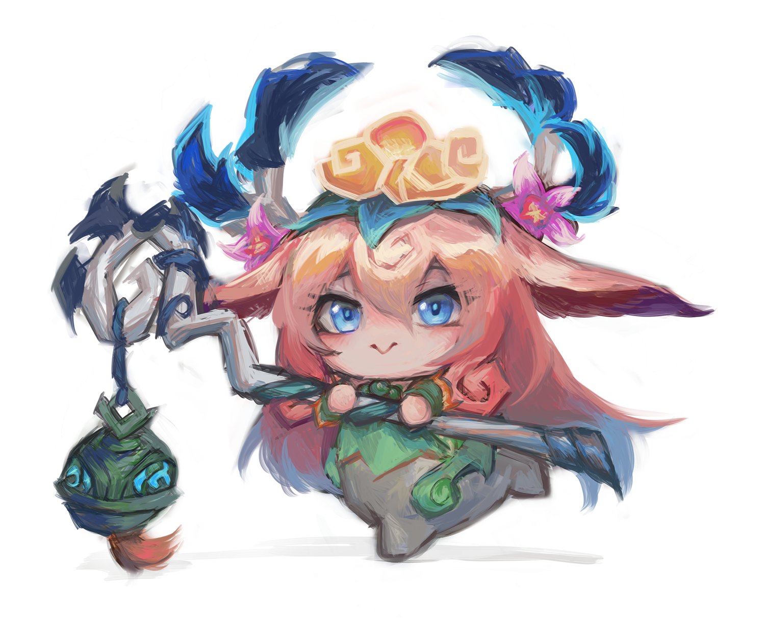 1girl :> blonde_hair blue_eyes full_body hair_between_eyes hair_ornament highres holding holding_staff horns horse_girl league_of_legends lillia_(league_of_legends) long_hair looking_at_viewer lxi_(lxi141) multicolored_hair pink_hair shan_hai_scrolls_lillia simple_background solo staff white_background