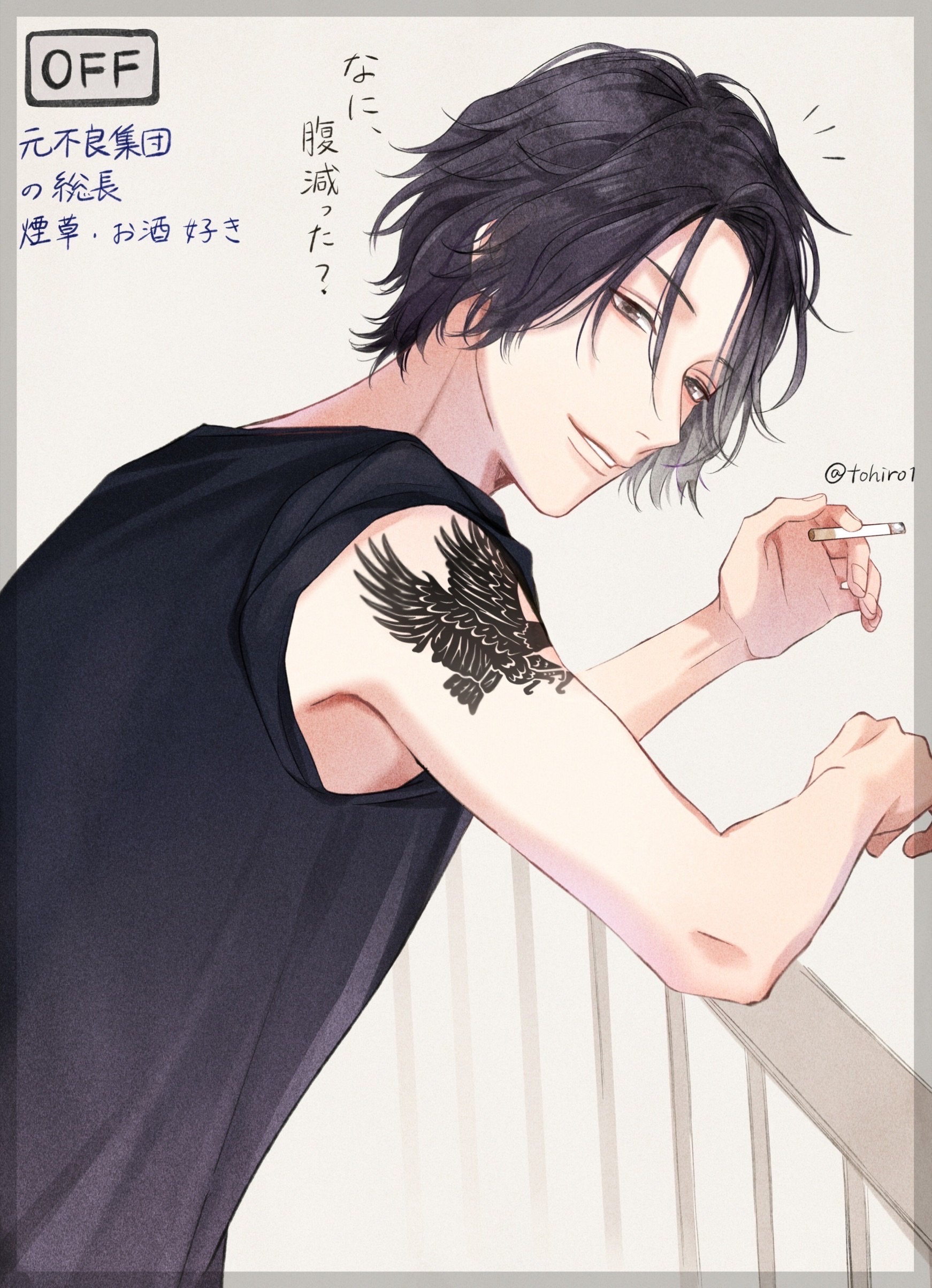 1boy absurdres bird_tattoo black_shirt border brown_eyes cigarette forehead from_side grey_border grin highres holding holding_cigarette leaning_forward looking_at_viewer male_focus notice_lines on_railing original parted_bangs parted_lips purple_hair railing shijima_tohiro shirt short_hair shoulder_tattoo sidelocks sleeveless sleeveless_shirt smile solo tattoo teeth translation_request upper_body