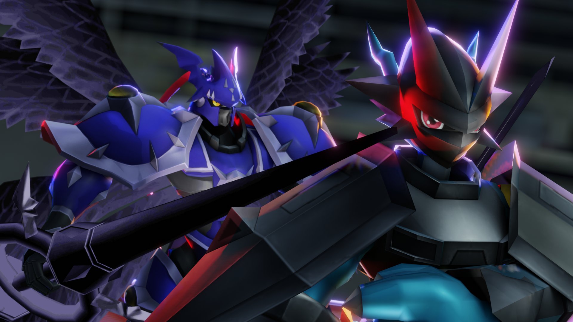 2others armor chaosdukemon digimon digimon_(creature) dukemon_chaos_mode highres magnamon_(battle_park) multiple_others red_eyes wings yellow_eyes