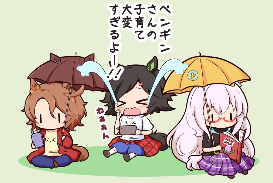 >_< 3girls animal_ears banana_print biwa_hayahide_(umamusume) black_hair blue_pants blue_shorts bnw_(umamusume) book brown_hair casual cellphone checkered_clothes checkered_jacket chibi clothes_around_waist commentary crying ear_ornament food_print fruit_print full_body gomashio_(goma_feet) hair_between_eyes hair_ornament hairclip holding holding_book holding_phone holding_umbrella horse_ears horse_girl jacket jacket_around_waist long_hair long_sleeves momotarou_densetsu multiple_girls narita_taishin_(umamusume) official_alternate_costume open_book open_clothes open_jacket open_mouth pants parted_bangs phone pink_hair plaid_clothes plaid_skirt pleated_skirt purple_skirt reading red-framed_eyewear red_jacket semi-rimless_eyewear short_hair short_sleeves shorts sitting skirt smartphone streaming_tears tears translation_request umamusume umbrella very_long_hair winning_ticket_(umamusume) |_|
