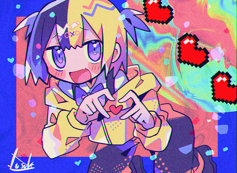 1girl black_hair blonde_hair blush character_request copyright_request fang heart heart_hands long_sleeves looking_at_viewer multicolored_hair open_mouth purple_eyes short_hair skin_fang smile solo yuusuke-kun