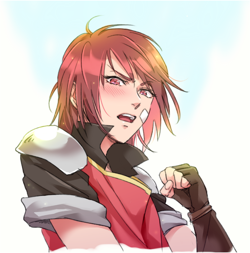1girl arc_the_lad arc_the_lad_iii bandage_on_face bandages blush cheryl_(arc_the_lad) clenched_hand fingerless_gloves gloves looking_at_viewer open_mouth over_wassyoi red_eyes red_hair short_hair solo teeth upper_teeth_only