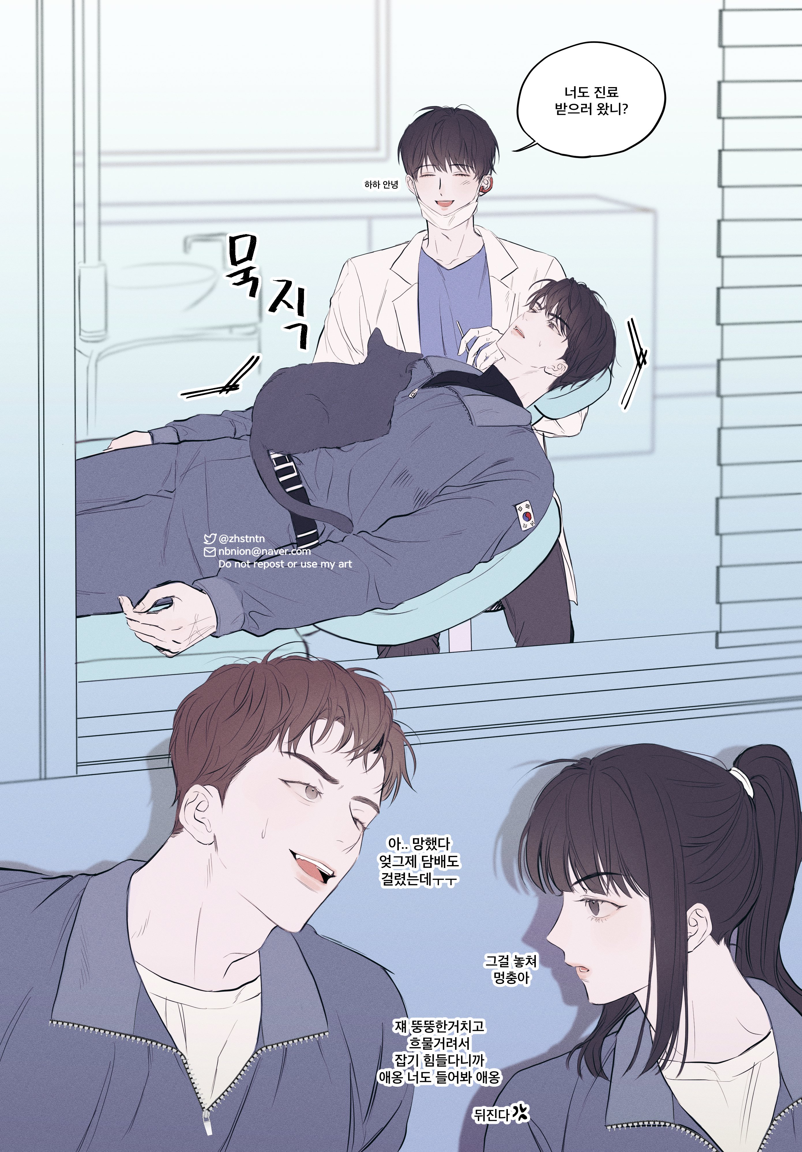 1girl 3boys absurdres animal animal_on_chest baek_ae-young belt black_cat black_eyes black_hair brown_eyes brown_hair cat closed_eyes comic commentary_request dental_chair dentist eoduun_badaui_deungbul-i_doeeo highres jihyeok_seo jumpsuit korean_commentary korean_text lab_coat long_hair long_sleeves looking_at_another lying mask mouth_mask multiple_boys on_back open_mouth park_moo-hyun ponytail shin_hae-ryang shirt short_hair smile south_korean_flag speech_bubble translation_request white_shirt zhstntn