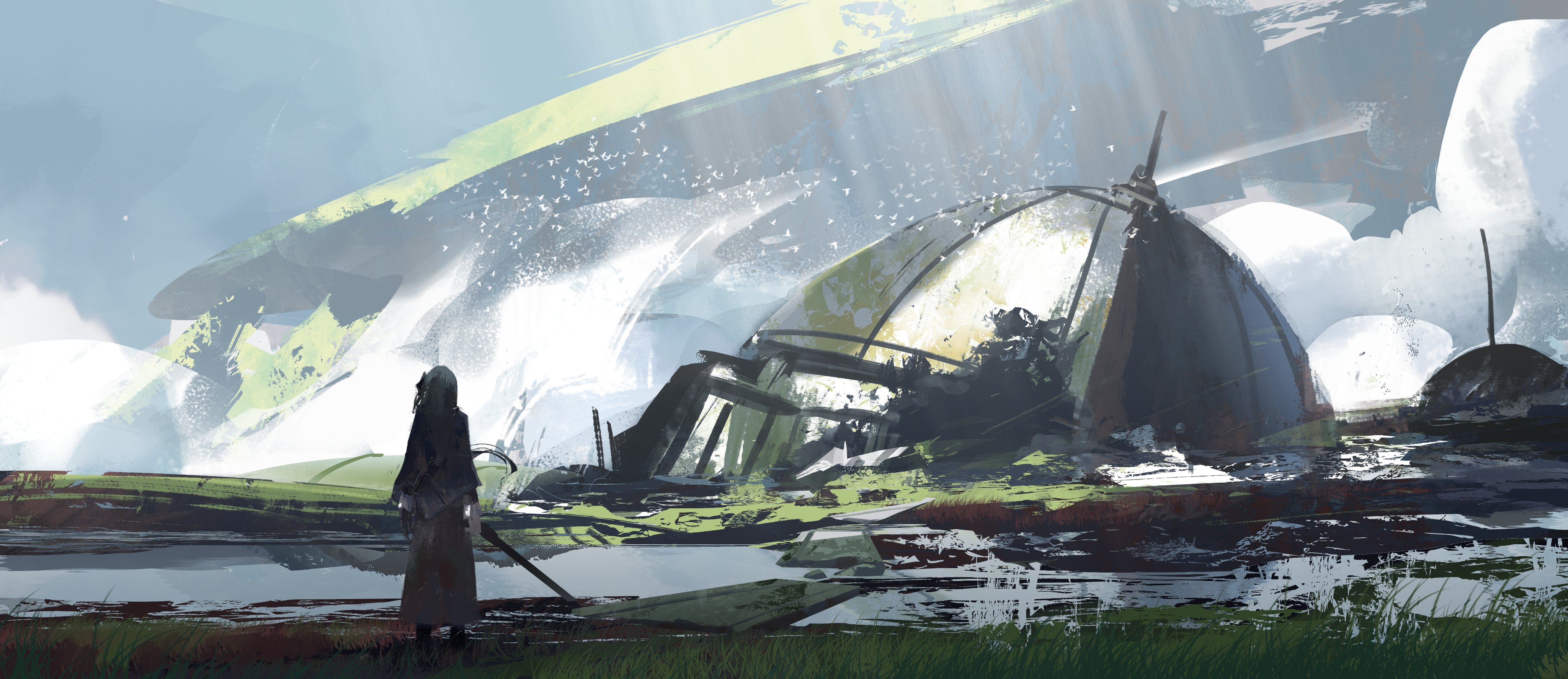 1girl abandoned absurdres asteroid_ill blonde_hair blue_sky brown_skirt cornea_(asteroid_ill) day dome fog from_behind grass highres holding holding_sword holding_weapon landscape light_rays long_sleeves moss nature one_side_up original outdoors overgrown post-apocalypse purple_shawl river ruins scenery shade shawl simple_bird skirt sky solo spire sword water weapon