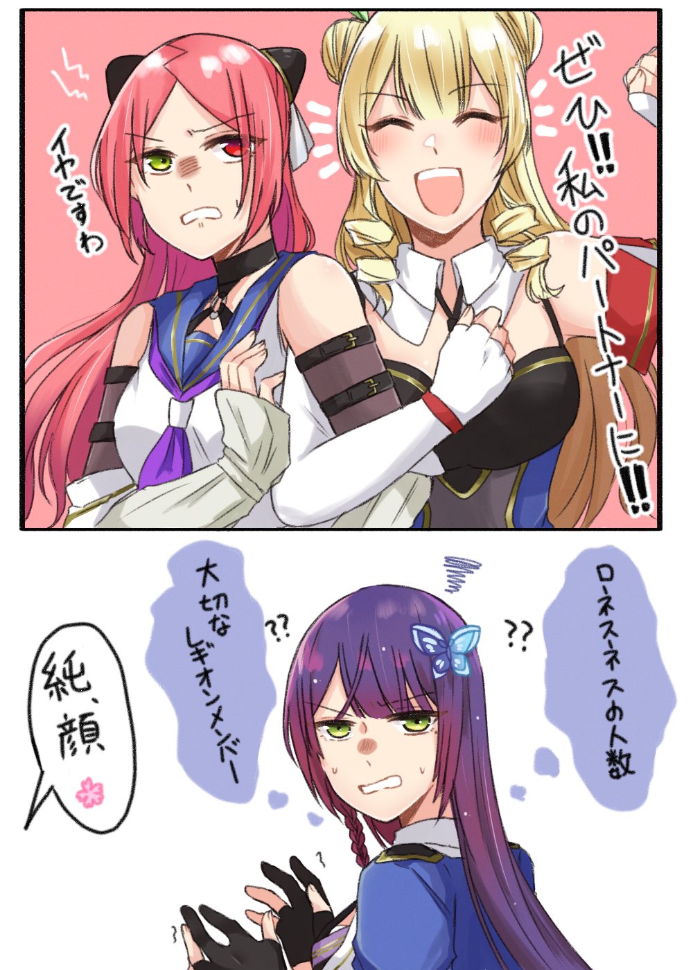 3girls :d ? ?? ^_^ annoyed arm_at_side arm_belt arm_hug arm_up assault_lily bare_shoulders belt belt_buckle black_belt black_necktie black_shirt blonde_hair blue_jacket blue_sailor_collar blush braid breasts buckle butterfly_hair_ornament clenched_hand clenched_teeth closed_eyes comic commentary detached_collar detached_sleeves double_bun drill_hair drill_sidelocks elbow_gloves epaulettes facing_viewer fingerless_gloves funada_kiito gloves green_eyes green_ribbon hair_bun hair_ornament hair_ribbon hairpods hands_up heterochromia highres jacket layered_sleeves long_hair long_sleeves looking_at_viewer looking_to_the_side medium_breasts multiple_girls neckerchief necktie nigari_(ngari_0115) notice_lines odaiba_girls_high_school_uniform open_mouth parted_bangs parted_lips partially_fingerless_gloves purple_hair purple_neckerchief red_background red_eyes red_hair ribbon saigou_kurena sailor_collar school_uniform serafuku shiba_tomoshibi shirt side_braid sidelocks simple_background single_braid sleeveless sleeveless_shirt smile speech_bubble spoken_flower squiggle sweatdrop teeth thought_bubble translated upper_body upper_teeth_only v-shaped_eyebrows white_background white_gloves white_shirt