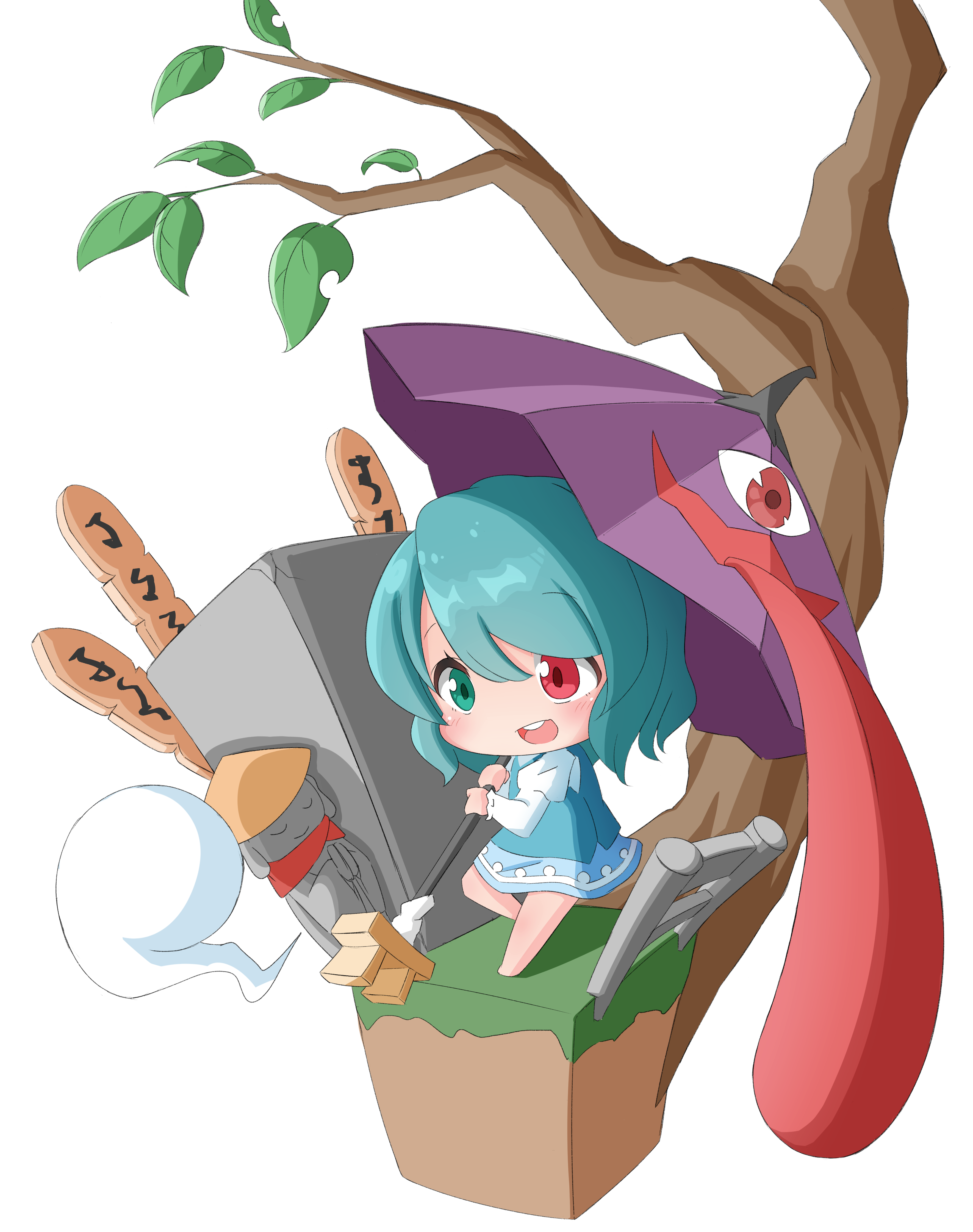 1girl absurdres akame00 barefoot blue_eyes blue_hair blue_skirt blue_vest chibi fence hat heterochromia highres holding holding_umbrella jizou juliet_sleeves karakasa_obake long_sleeves oil-paper_umbrella open_mouth puffy_sleeves purple_umbrella red_eyes rice_hat shirt short_hair skirt solo tatara_kogasa teeth touhou tree umbrella upper_teeth_only vest white_shirt