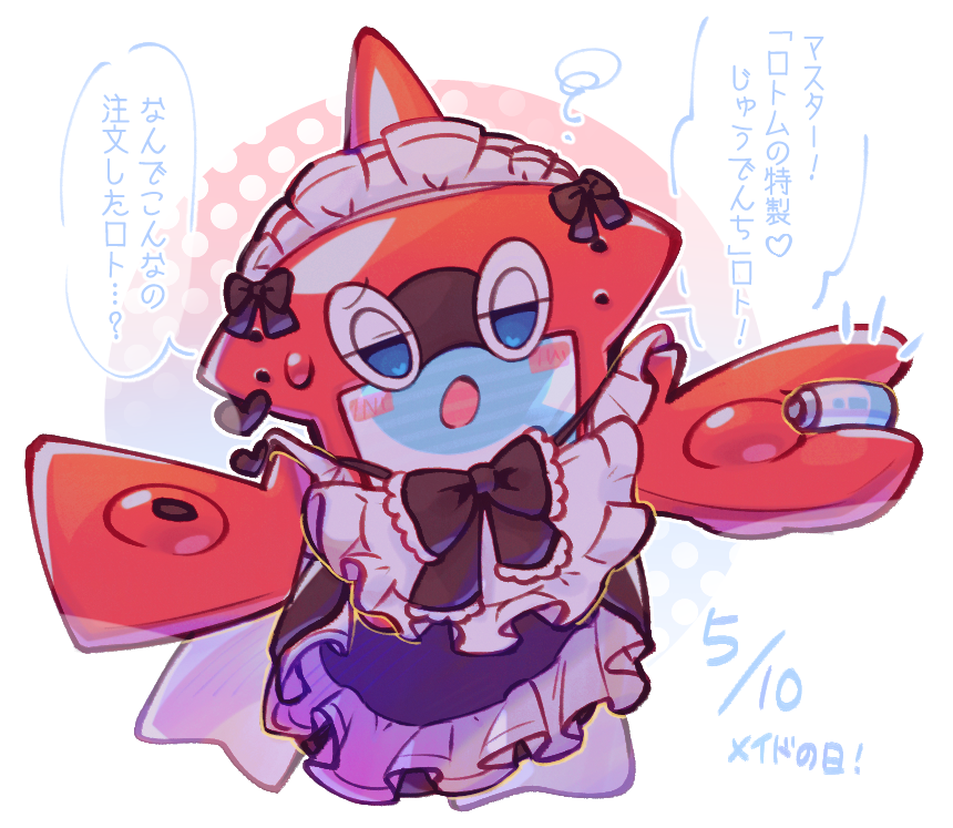 blue_eyes blush_stickers bow clothed_pokemon commentary_request dated frills gen_4_pokemon half-closed_eyes holding kokemushi_(kuru_fox) maid_headdress nintendo no_humans notice_lines pokemon pokemon_(creature) raised_eyebrow rotom rotom_dex solo speech_bubble squiggle translation_request