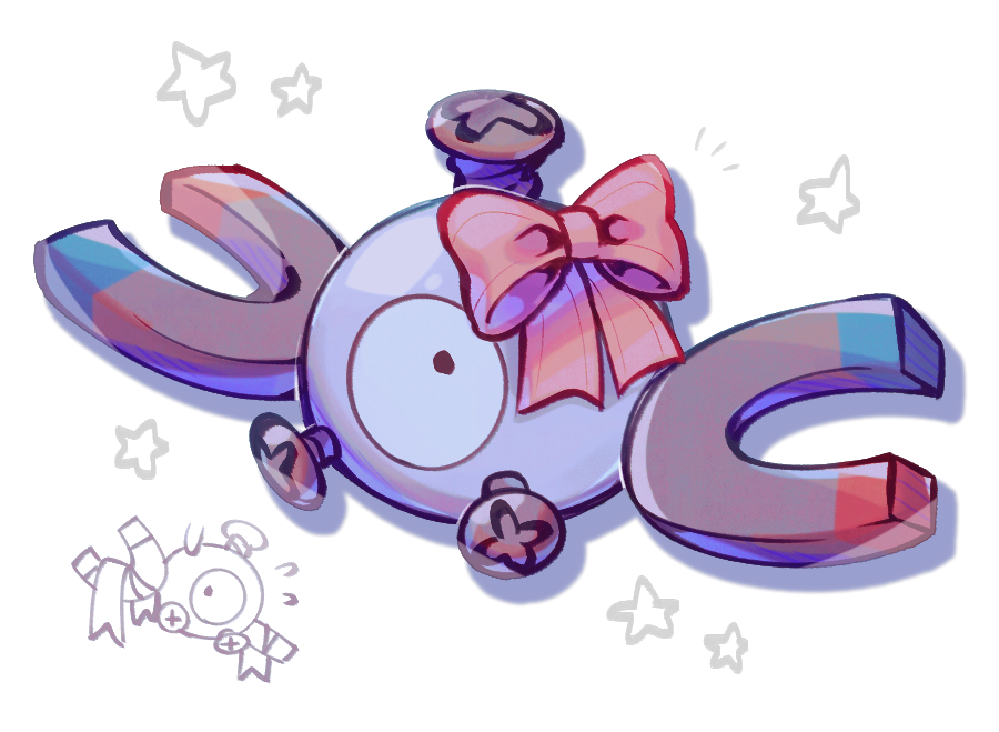 black_eyes bow commentary_request flying_sweatdrops gen_1_pokemon kokemushi_(kuru_fox) magnemite magnet nintendo no_humans partially_colored pokemon pokemon_(creature) ribbon screw star_(symbol)