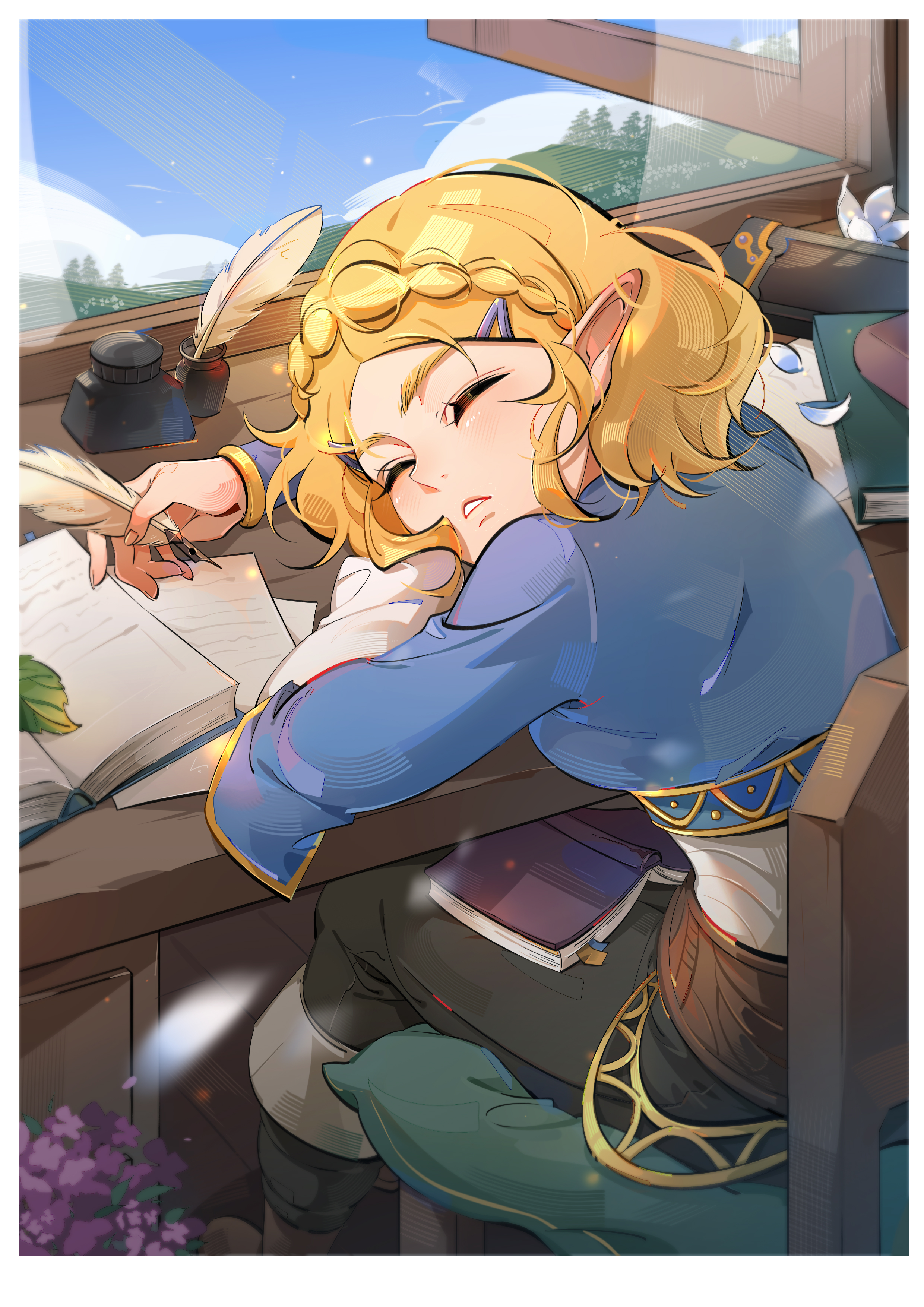 1girl absurdres black_pants blonde_hair blue_shirt blue_sky book book_on_lap boots braid chair closed_eyes commentary_request crown_braid hair_ornament hairclip head_rest highres holding holding_quill indoors knee_boots momoju163 nintendo on_chair open_book open_window pants parted_bangs parted_lips pointy_ears princess_zelda quill shirt sitting sky sleeping solo the_legend_of_zelda the_legend_of_zelda:_tears_of_the_kingdom wind window