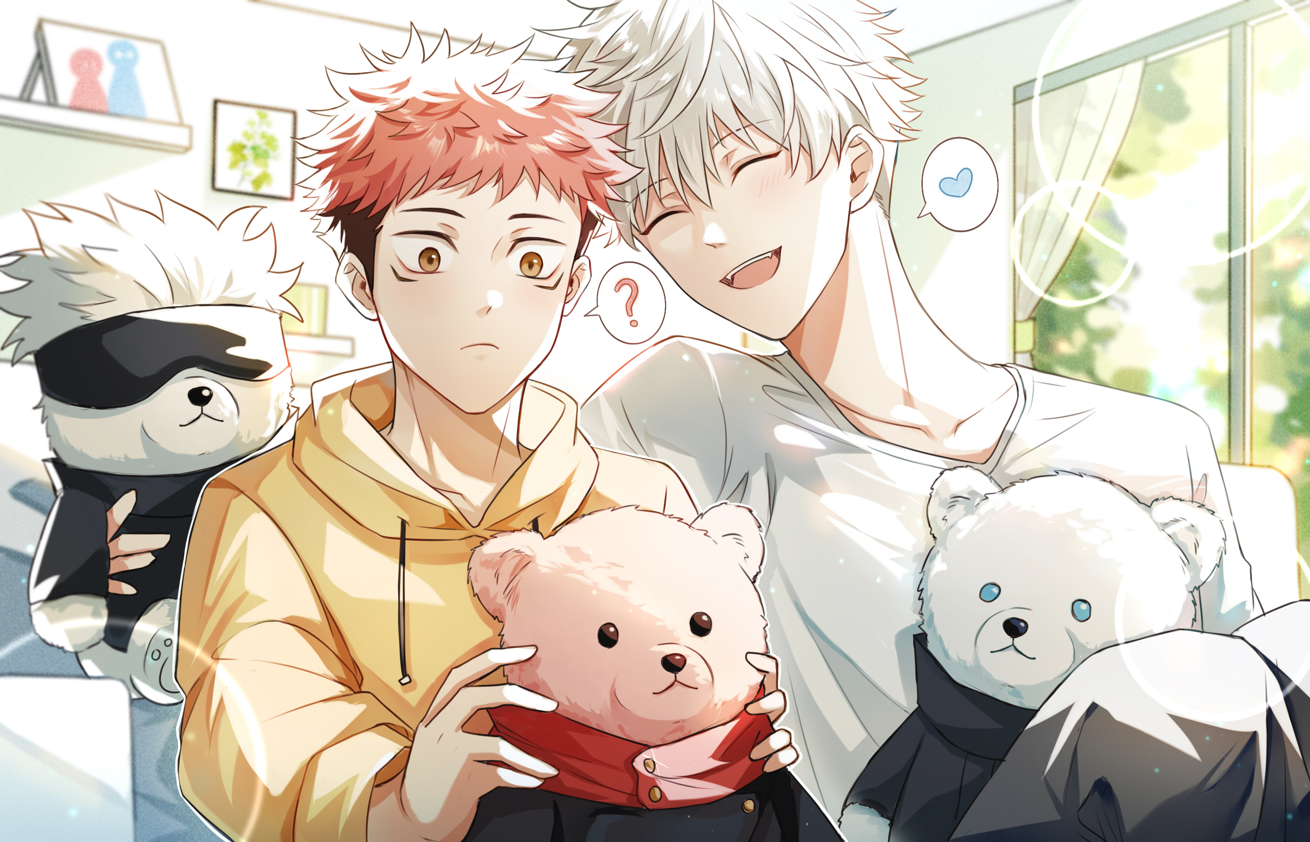 2boys ? aguaaaaa4 closed_eyes closed_mouth fangs gojo_satoru highres hood hoodie itadori_yuji jujutsu_kaisen male_focus multiple_boys open_mouth pink_hair shirt short_hair stuffed_animal stuffed_toy teddy_bear white_hair white_shirt yellow_eyes yellow_hoodie
