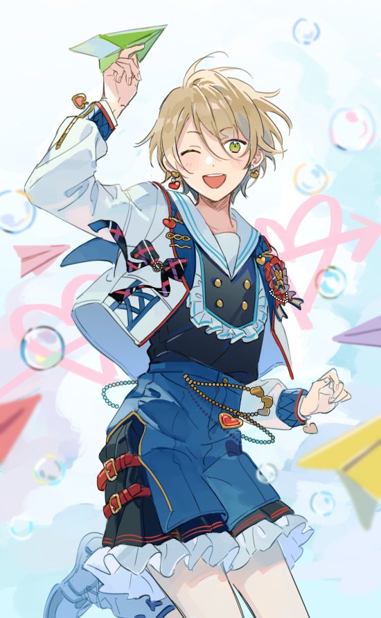 1boy ;d arrow_(symbol) arrow_through_heart blonde_hair blue_shirt blue_shorts bow bubble commentary earrings ensemble_stars! foot_out_of_frame frilled_shorts frills green_eyes hand_up heart heart_earrings holding holding_paper_airplane jacket jewelry jumping long_sleeves looking_at_viewer male_focus one_eye_closed open_mouth paper_airplane plaid_bow sailor_collar seuga shiratori_aira_(ensemble_stars!) shirt short_hair shorts simple_background smile solo untranslatable_commentary teeth upper_teeth_only white_background white_jacket white_sailor_collar
