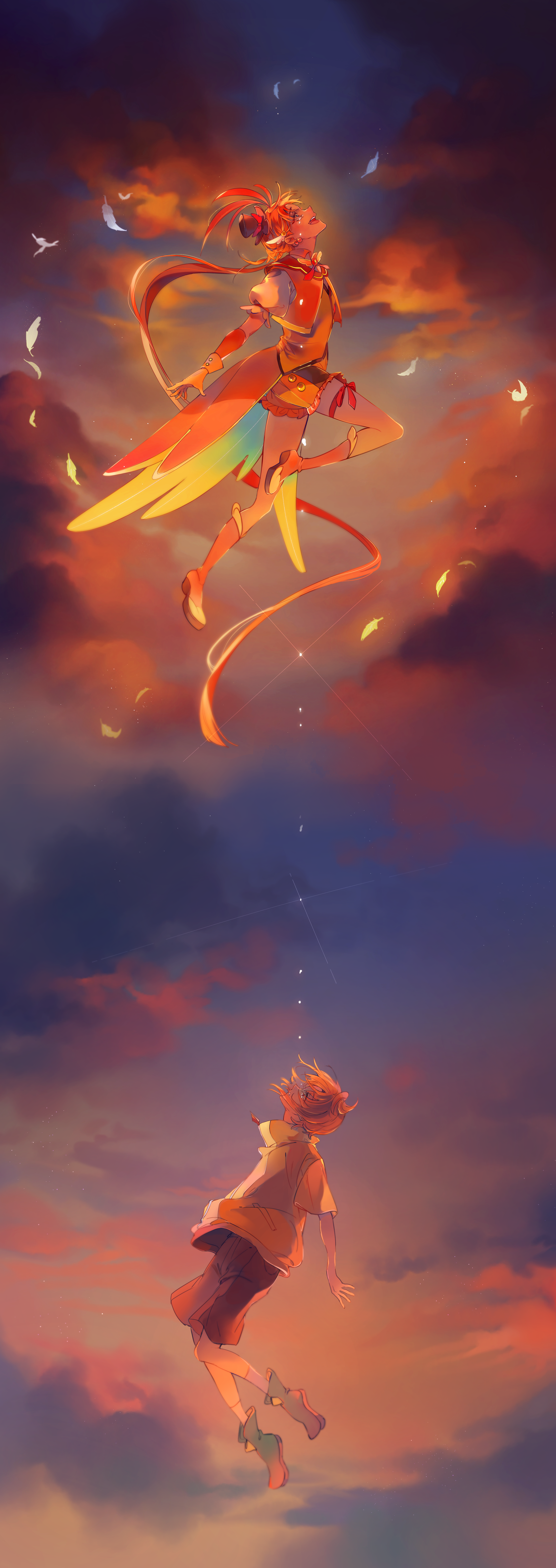 2boys absurdres black_headwear black_shorts boots brown_footwear brown_shirt coattails collared_shirt cropped_jacket crying crying_with_eyes_open cure_wing detached_sleeves dual_persona earrings feather_hair_ornament feathers floating flying frilled_shorts frilled_sleeves frills hair_ornament hair_over_one_eye hat highres hirogaru_sky!_precure jacket jewelry knee_up leg_ribbon long_hair looking_at_another looking_up low_ponytail magical_boy mini_hat mini_top_hat multiple_boys nirin orange_boots orange_hair orange_jacket orange_shorts orange_sky orange_vest overcast ponytail precure puffy_short_sleeves puffy_sleeves ribbon shirt short_hair short_shorts short_sleeves shorts sky socks tailcoat tears top_hat vest white_shirt white_socks yuunagi_tsubasa