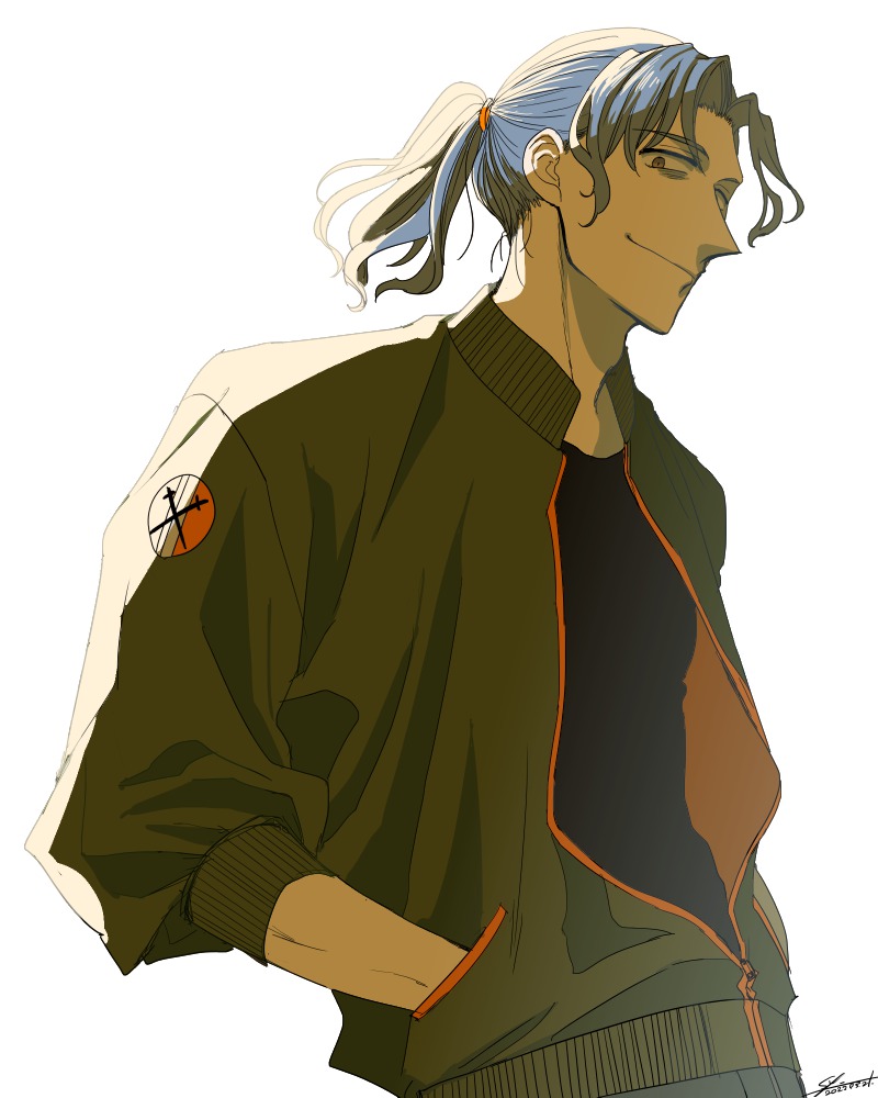 1boy alternate_costume alternate_hairstyle black_shirt fate/grand_order fate_(series) green_jacket hair_tie hands_in_pockets jacket looking_at_viewer male_focus medium_hair open_clothes open_jacket ponytail saitou_hajime_(buddy_cop)_(fate) saitou_hajime_(fate) shirt signature simple_background smile solo upper_body white_background yellow_eyes yuuzuki230