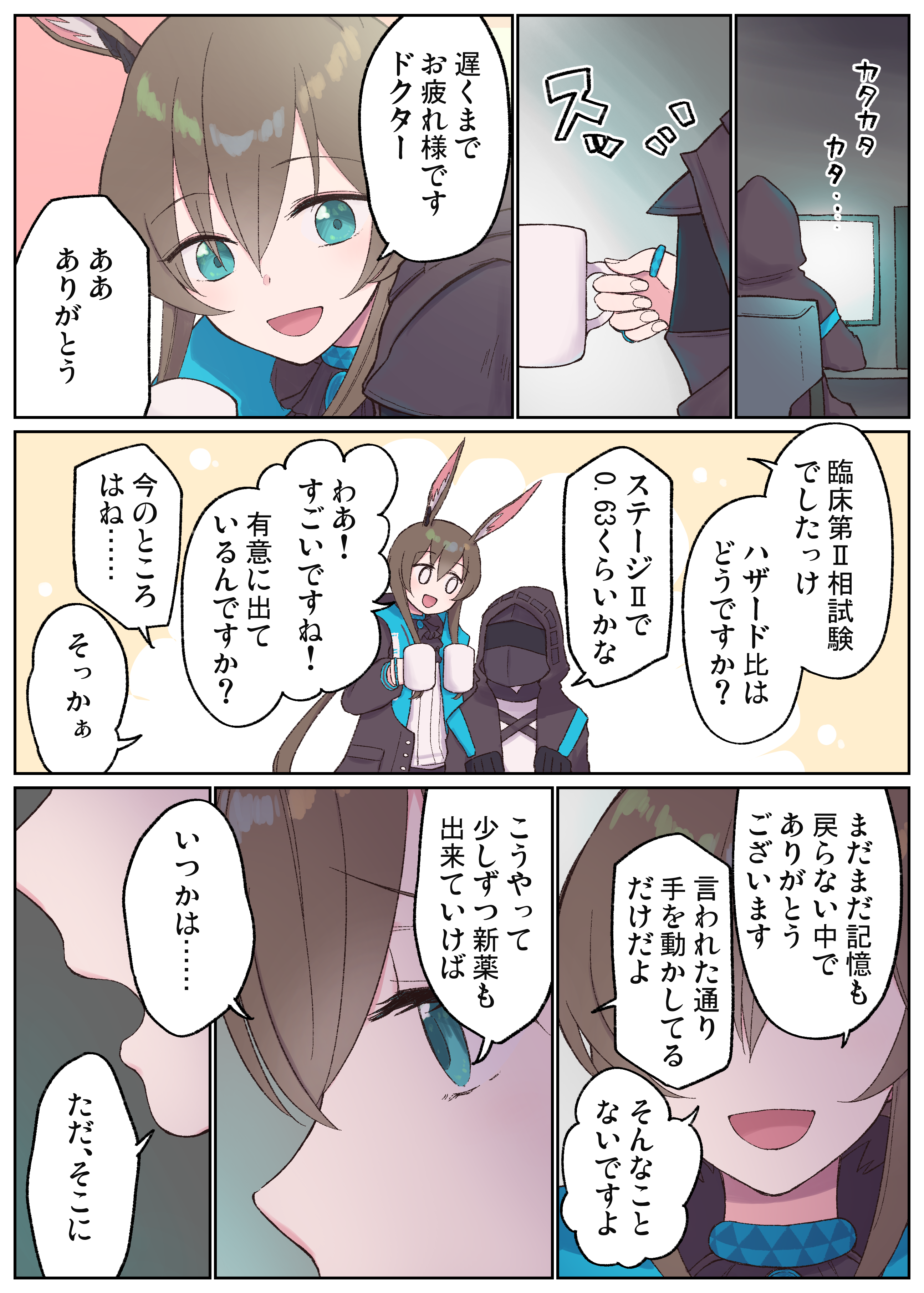 1girl 1other absurdres ambiguous_gender amiya_(arknights) animal_ears arknights black_coat black_jacket blue_eyes brown_hair coat comic commentary_request computer cup doctor_(arknights) hair_between_eyes highres holding holding_cup hood hooded_coat jacket long_hair open_mouth pic_postcard rabbit_ears sitting translation_request