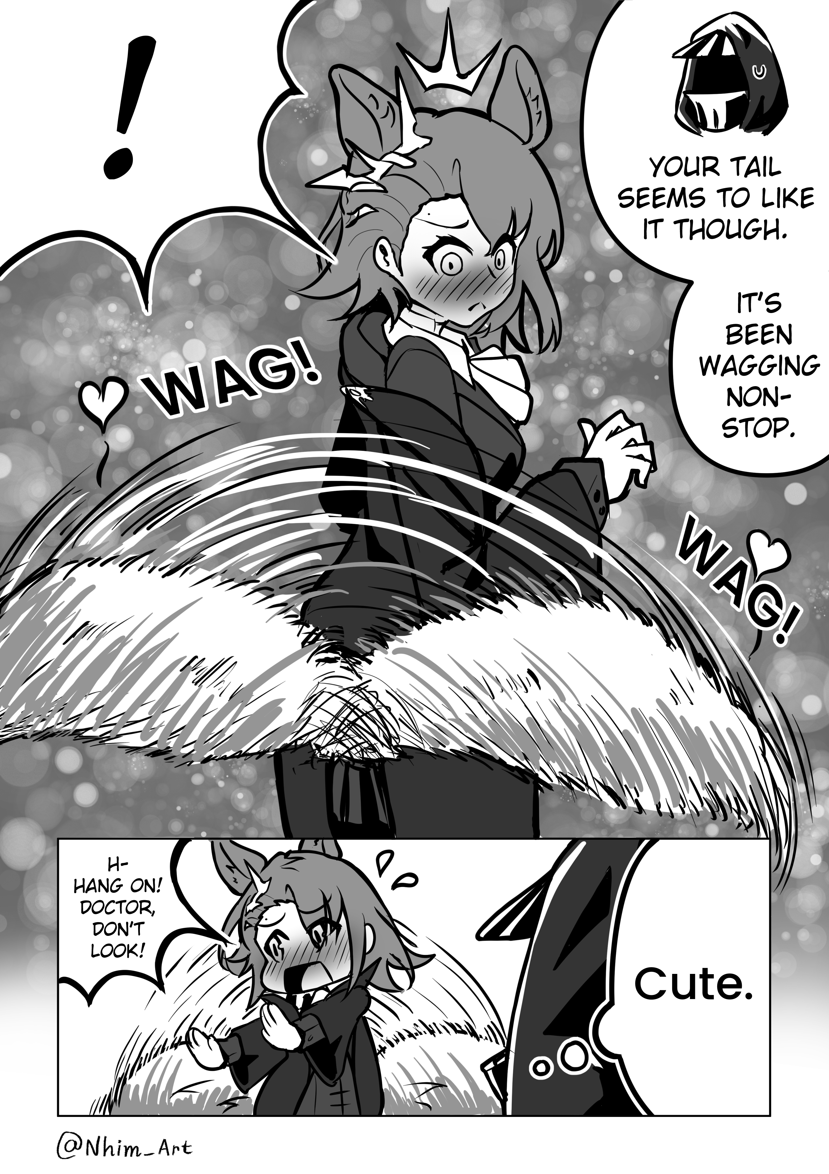 ! 1girl 1other ^^^ absurdres afterimage animal_ears arknights blush chibi comic doctor_(arknights) dress english_text flying_sweatdrops greyscale heart highres hood hood_up jacket long_sleeves looking_back monochrome motion_lines nhim nose_blush open_clothes open_jacket penance_(arknights) speed_lines spoken_exclamation_mark tail tail_wagging wide_sleeves