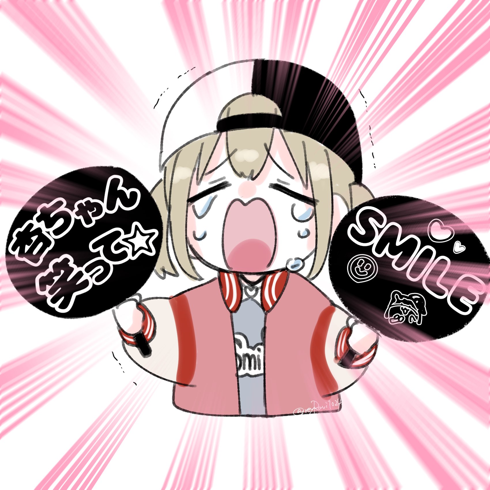 1girl azusawa_kohane baseball_cap blonde_hair closed_eyes hand_fan hat highres holding holding_fan jacket jewelry long_sleeves necklace open_clothes open_jacket open_mouth project_sekai reyravi1024 short_twintails solo tears translation_request twintails upper_body