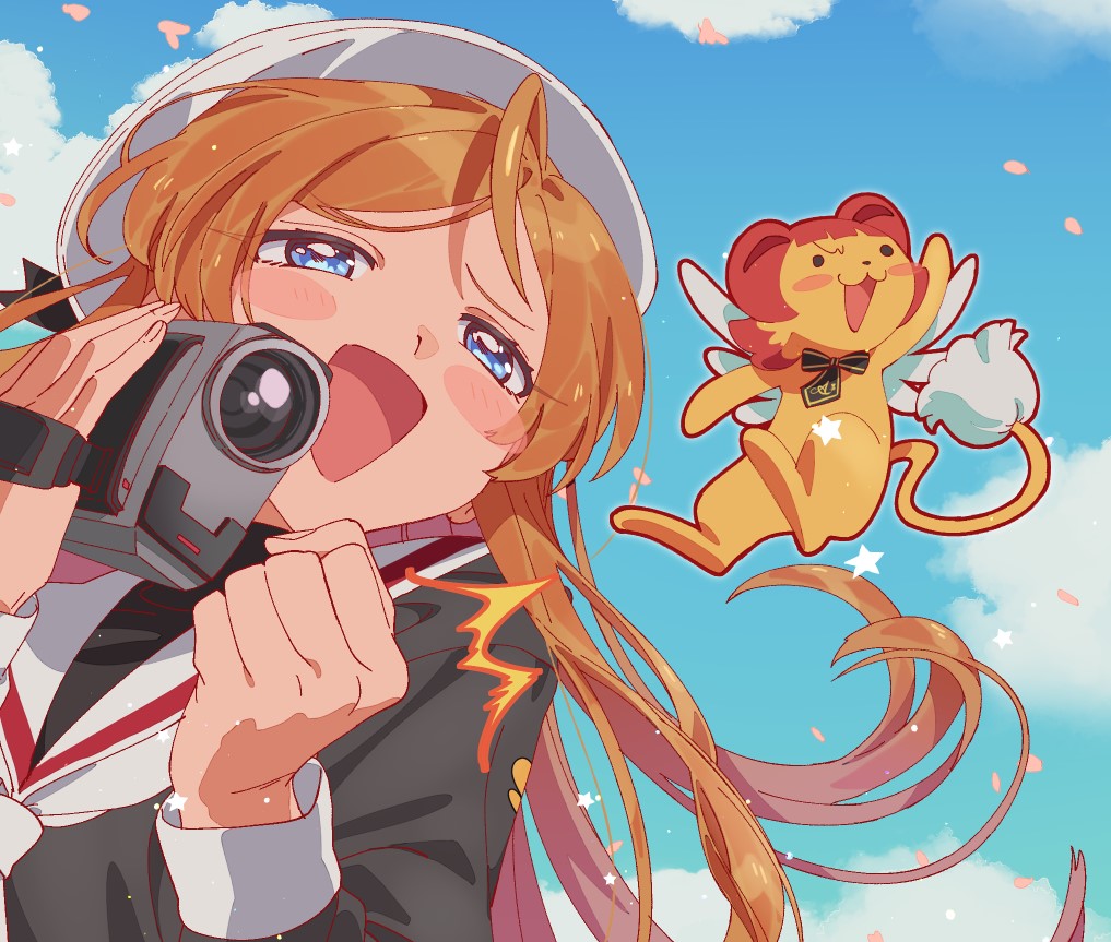 1girl 1other ^^^ ahoge black_ribbon black_shirt blue_eyes blue_sky blush breasts brown_hair camcorder camera cardcaptor_sakura cloud cosplay daidouji_tomoyo daidouji_tomoyo_(cosplay) day falling_petals hands_up hat hat_ribbon holding holding_camera hoyaza1561 idolmaster idolmaster_million_live! idolmaster_million_live!_theater_days kero_(cardcaptor_sakura) large_breasts long_hair long_sleeves looking_at_another neckerchief nonohara_akane open_mouth parody petals ribbon sailor_collar school_uniform shinomiya_karen shirt sky smile star_(symbol) tomoeda_elementary_school_uniform tomoeda_middle_school_uniform video_camera white_headwear white_neckerchief white_sailor_collar