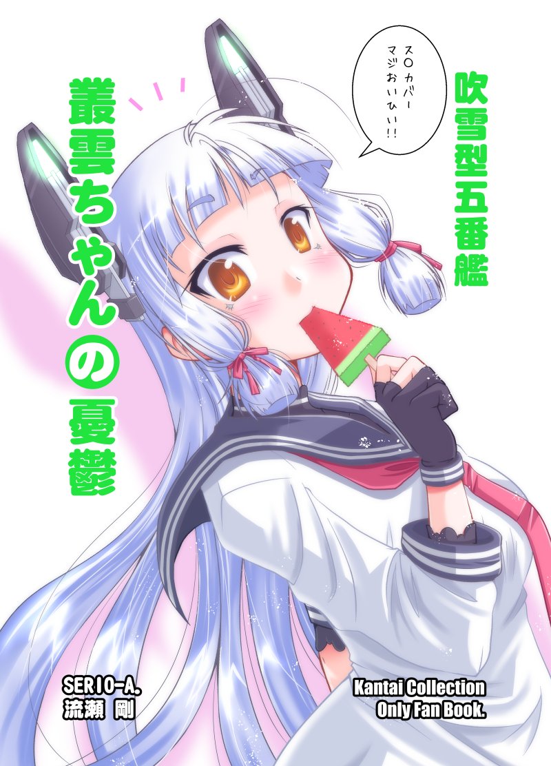 black_sailor_collar blunt_bangs commentary_request dress eating floating_headgear food hair_ribbon headgear kantai_collection long_hair murakumo_(kancolle) nagase_takeshi necktie orange_eyes popsicle red_necktie ribbon sailor_collar sailor_dress sidelocks translation_request tress_ribbon watermelon_bar white_dress white_hair