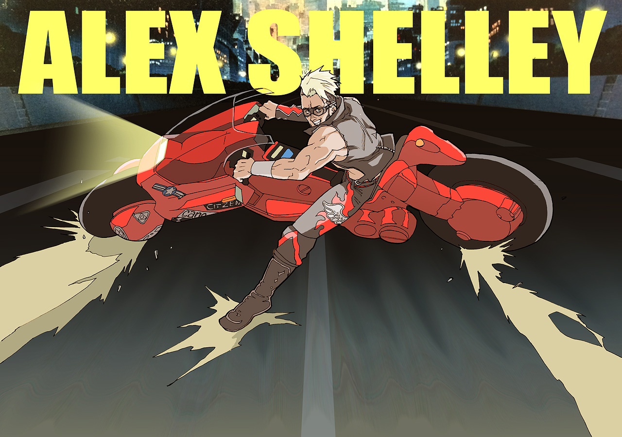 1boy akira_(manga) akira_slide alex_shelley beard black_hair blonde_hair character_name commentary_request crossover english_text facial_hair goggles grin impact_wrestling kaneda_shoutarou's_bike kyobashi looking_at_viewer male_focus motor_vehicle motorcycle multicolored_hair muscular muscular_male new_japan_pro_wrestling pants parody short_hair smile solo vest wrestler wrestling