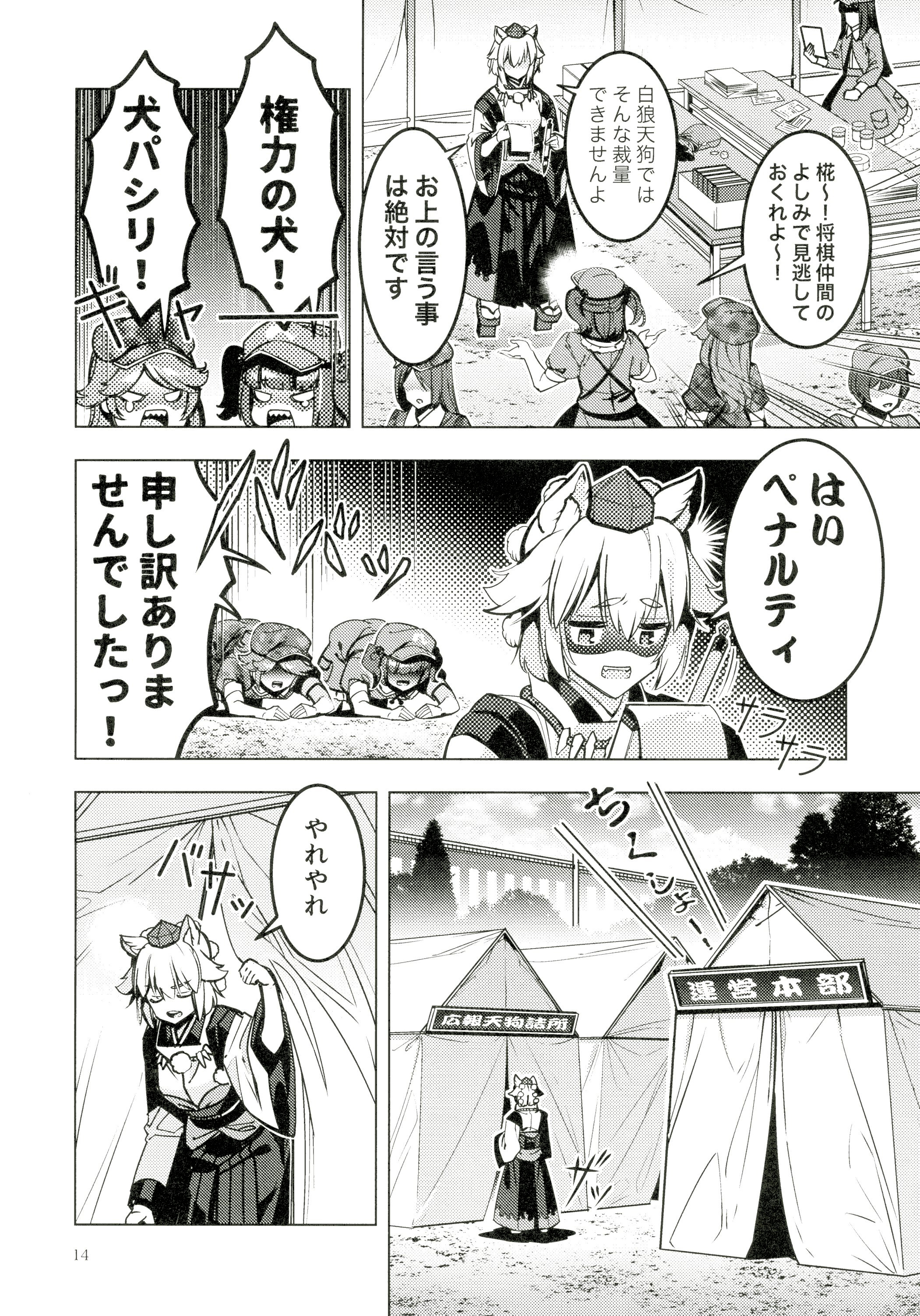 6+girls absurdres animal_ears blouse camouflage camouflage_shirt comic dark_haired_kappa greyscale hair_bobbles hair_ornament hat highres inubashiri_momiji japanese_clothes kappa_mob_(touhou) kawashiro_nitori key long_sleeves medium_hair monochrome multiple_girls page_number shirt short_hair short_sleeves tokin_hat touhou translation_request twintails two_side_up wolf_ears yamashiro_takane zounose