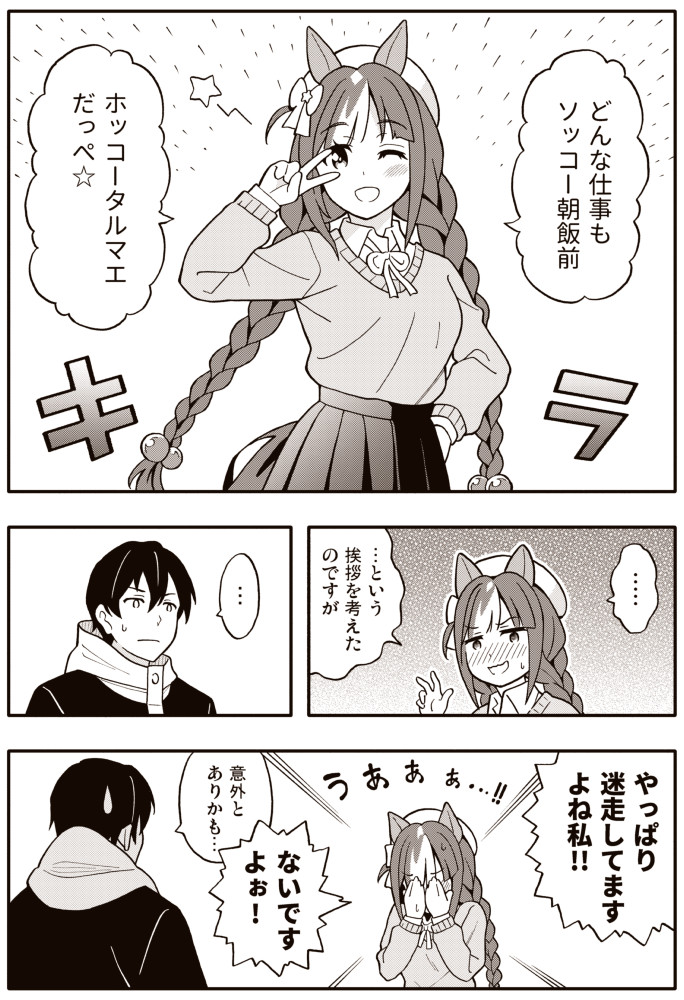 ... 1boy 1girl alternate_costume amasawa_natsuhisa beret braid breasts casual comic commentary_request covering_face ear_covers embarrassed greyscale hat hokko_tarumae_(casual)_(umamusume) hokko_tarumae_(umamusume) long_braid long_hair looking_at_viewer medium_breasts monochrome one_eye_closed open_mouth ribbon sweat trainer_(umamusume) translation_request twin_braids umamusume v v_over_eye