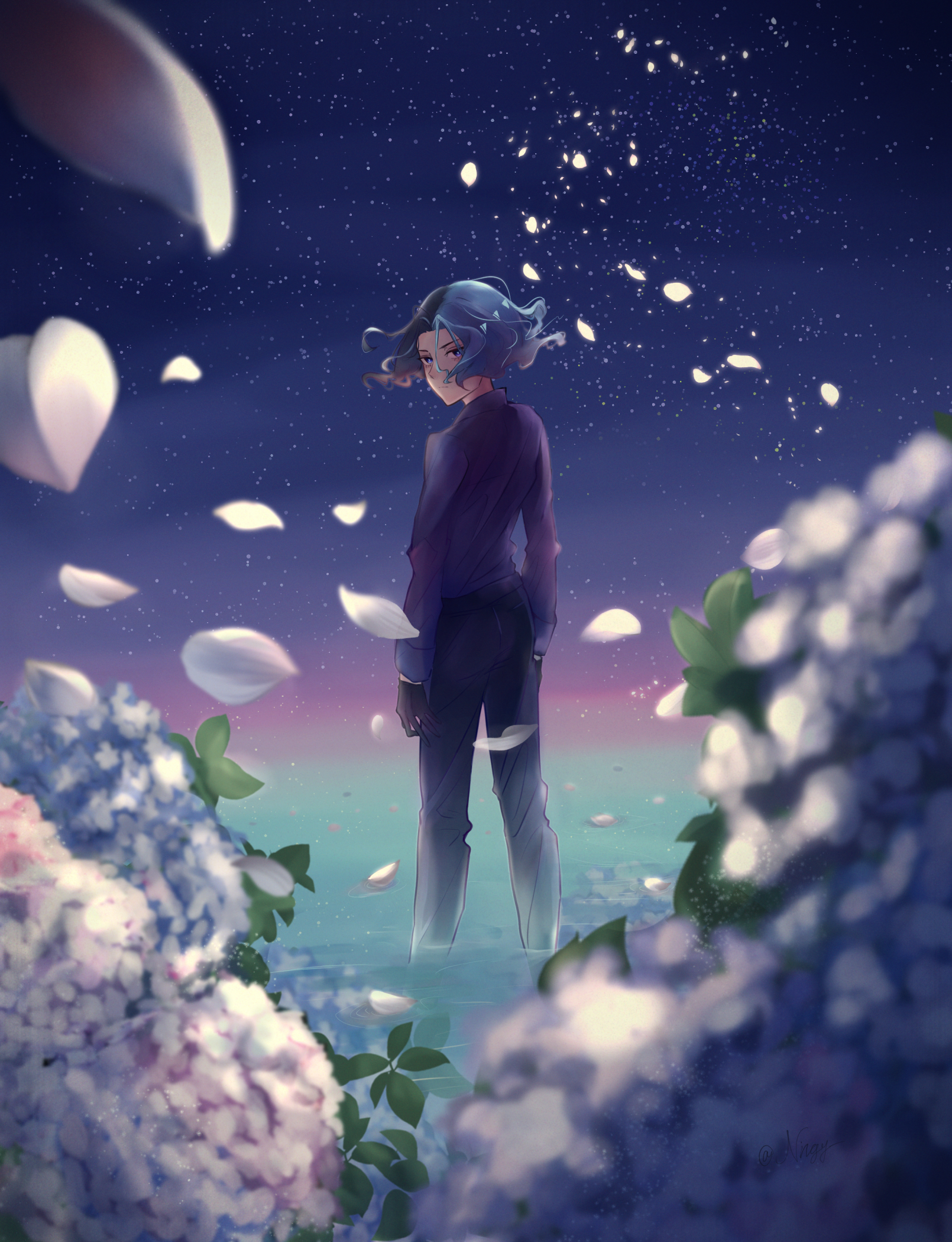 1boy amethio_(pokemon) closed_mouth falling_petals floating_hair flower from_behind gloves highres long_sleeves looking_back male_focus night nintendo nirugiri_(nirgy) outdoors pants petals pokemon pokemon_(anime) pokemon_horizons shirt short_hair sky standing star_(sky) starry_sky wading water