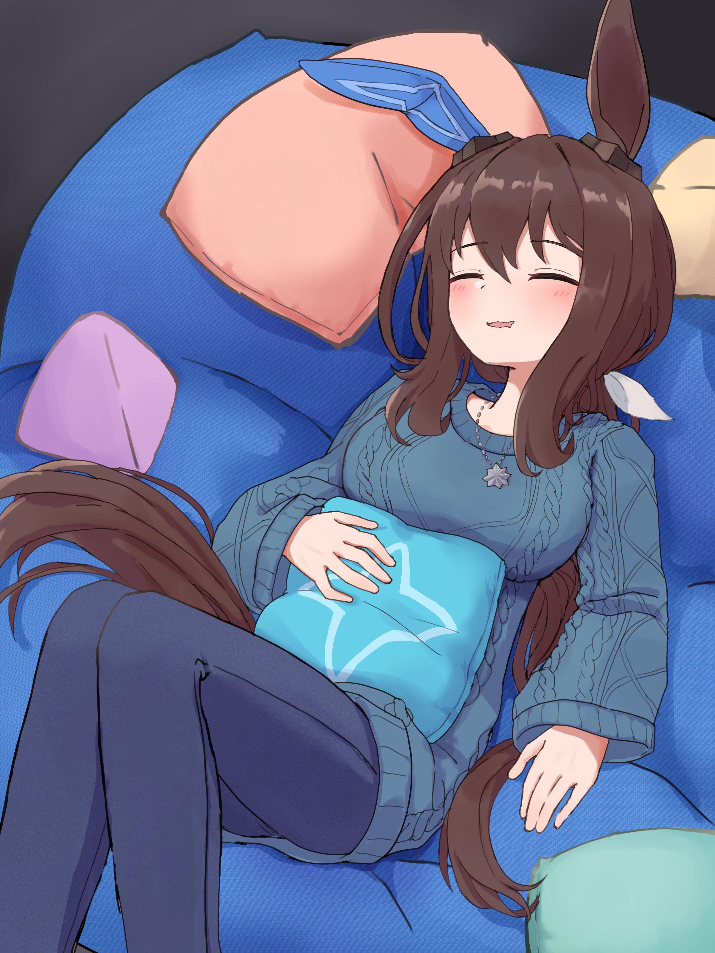 1girl absurdres admire_vega_(umamusume) animal_ears blush breasts casual fluffy hair_between_eyes hair_ornament highres horse_ears horse_girl horse_tail jewelry long_hair medium_breasts necklace open_mouth pillow ponytail shorts simple_background sitting solo suiro_no_sakana tail umamusume