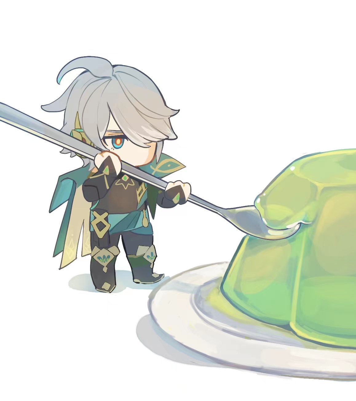 1boy ahoge alhaitham_(genshin_impact) aqua_belt aqua_eyes aqua_hair asymmetrical_sidelocks belt black_footwear black_pants boots cable cape chest_jewel chibi food from_side full_body gauntlets gelatin gem genshin_impact gloves gold_trim green_cape green_gem grey_hair hair_between_eyes hair_over_one_eye headphones highres holding holding_spoon looking_at_food male_focus multicolored_eyes multicolored_hair no_mouth one_eye_covered pants parted_bangs plate shirt shoes short_hair sidelocks simple_background spoon standing white_background ze123456n