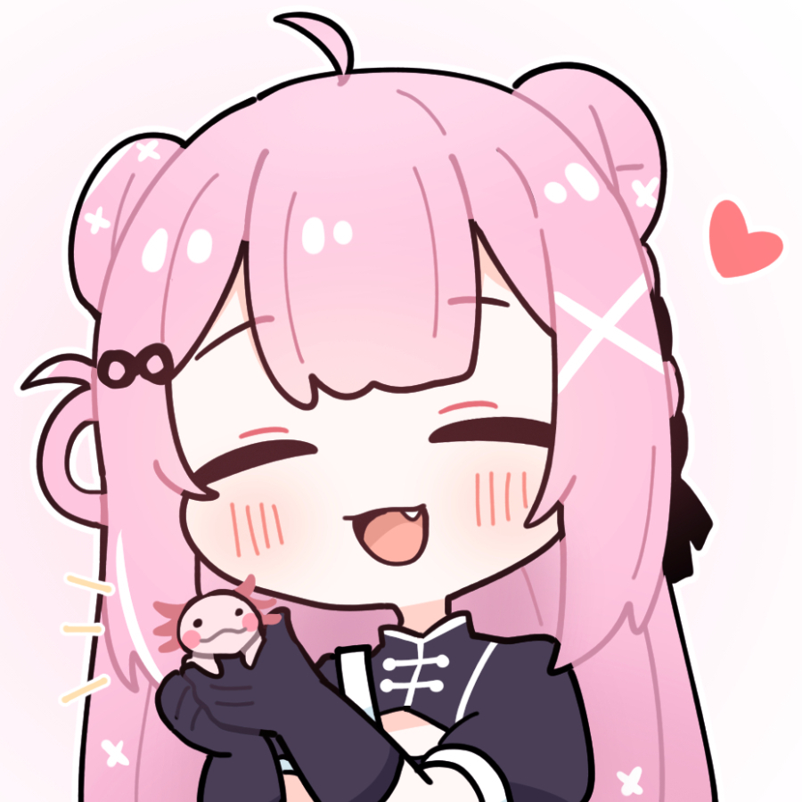 1girl :3 ahoge axolotl black_gloves black_ribbon blush chinese_clothes closed_eyes clothing_cutout collar double_bun fang gloves gradient_background hair_between_eyes hair_bun hair_ornament hairpin heart indie_virtual_youtuber long_hair mikeneko_(vtuber) mikeneko_(3rd_costume)_(vtuber) niconico pink_hair ribbon sakana_(saka11205) sidelocks simple_background virtual_youtuber