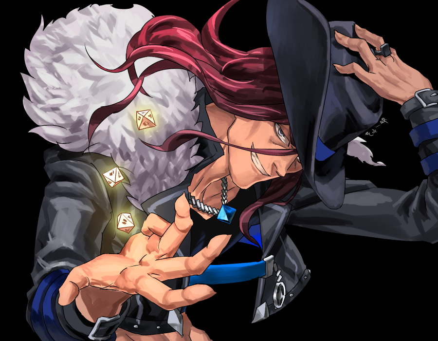 1boy artist_name black_background black_shirt commentary_request cropped_jacket dice fedora fur-trimmed_jacket fur_trim glowing grey_eyes grin hand_on_headwear hands_up hat jacket jewelry long_hair male_focus megido72 mephisto_(megido72) necklace oyatsu_(hana) red_hair ring shirt simple_background smile solo upper_body