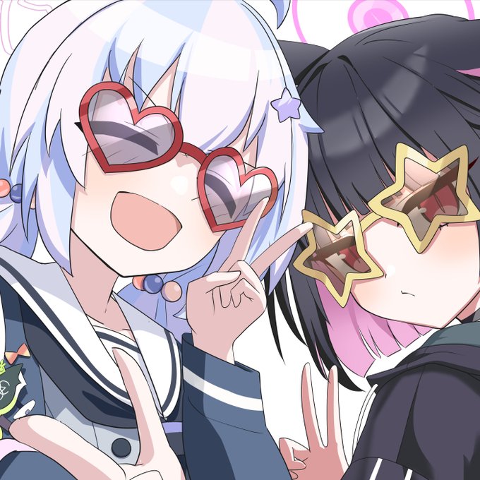 2girls :d ^_^ ahoge animal_ears black_choker black_coat black_hair black_sweater blue_archive blunt_bangs cat_ears cat_girl choker closed_eyes coat colored_inner_hair commentary_request from_behind glasses hair_between_eyes hair_bobbles hair_ornament halo heart heart-shaped_eyewear kazusa_(blue_archive) long_hair long_sleeves looking_at_viewer looking_back low_twintails multicolored_hair multiple_girls open_clothes open_coat open_mouth purple_hair red_eyes reisa_(blue_archive) school_uniform serafuku shooka short_hair sidelocks simple_background smile star-shaped_eyewear star_(symbol) star_hair_ornament sunglasses sweater twintails two-tone_hair v white_background